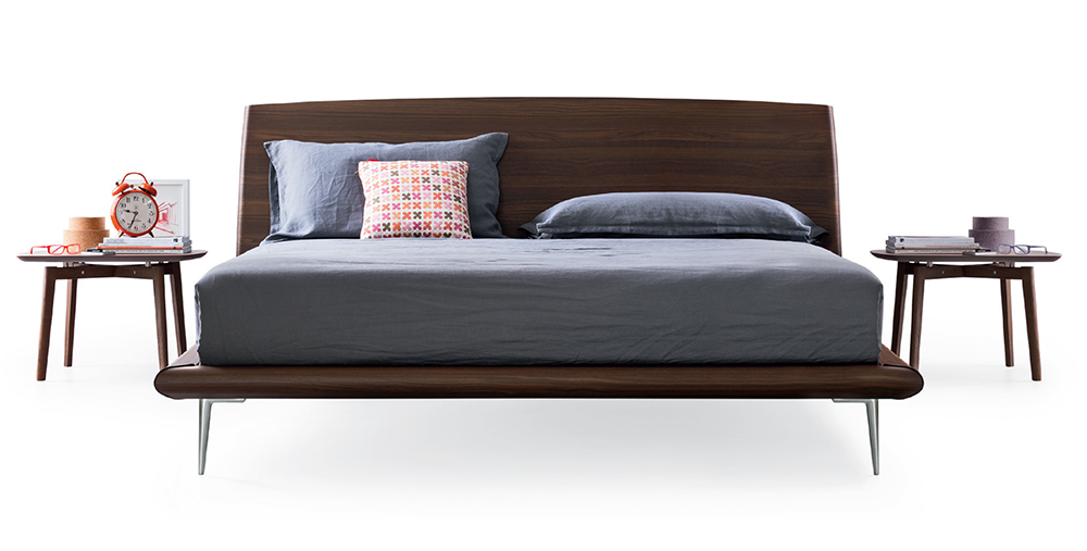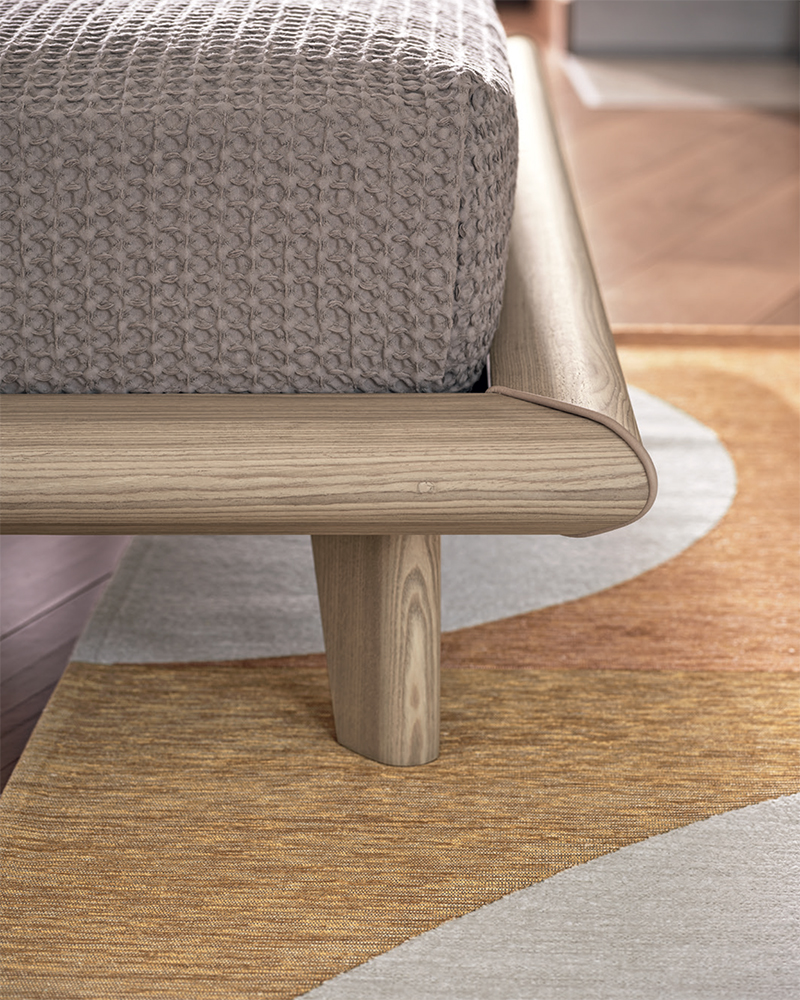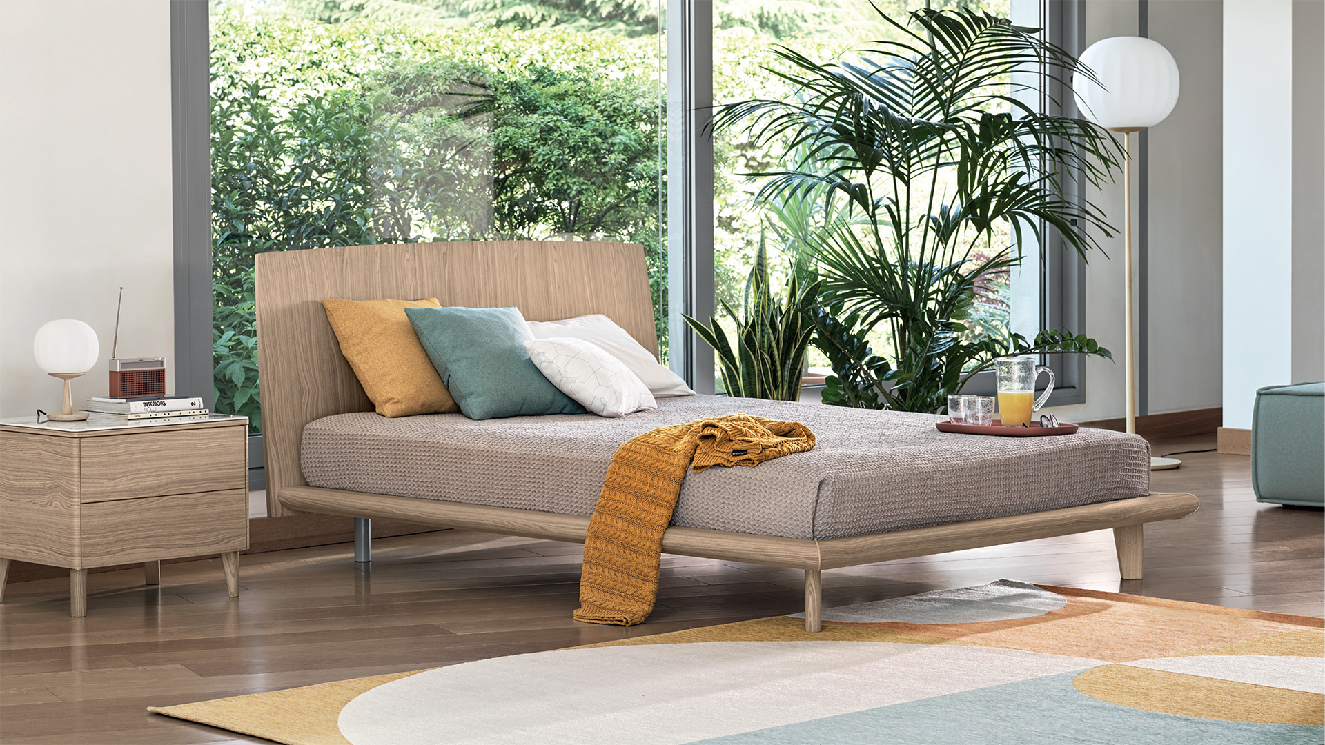 Dixie double bed is characterized by a large and slightly curved wooden headboard, while front feet can be chosen between wooden or metal type. The included wooden slats lie under the mattress and rest on horizontal supports, guaranteeing the best comfort while sleeping.