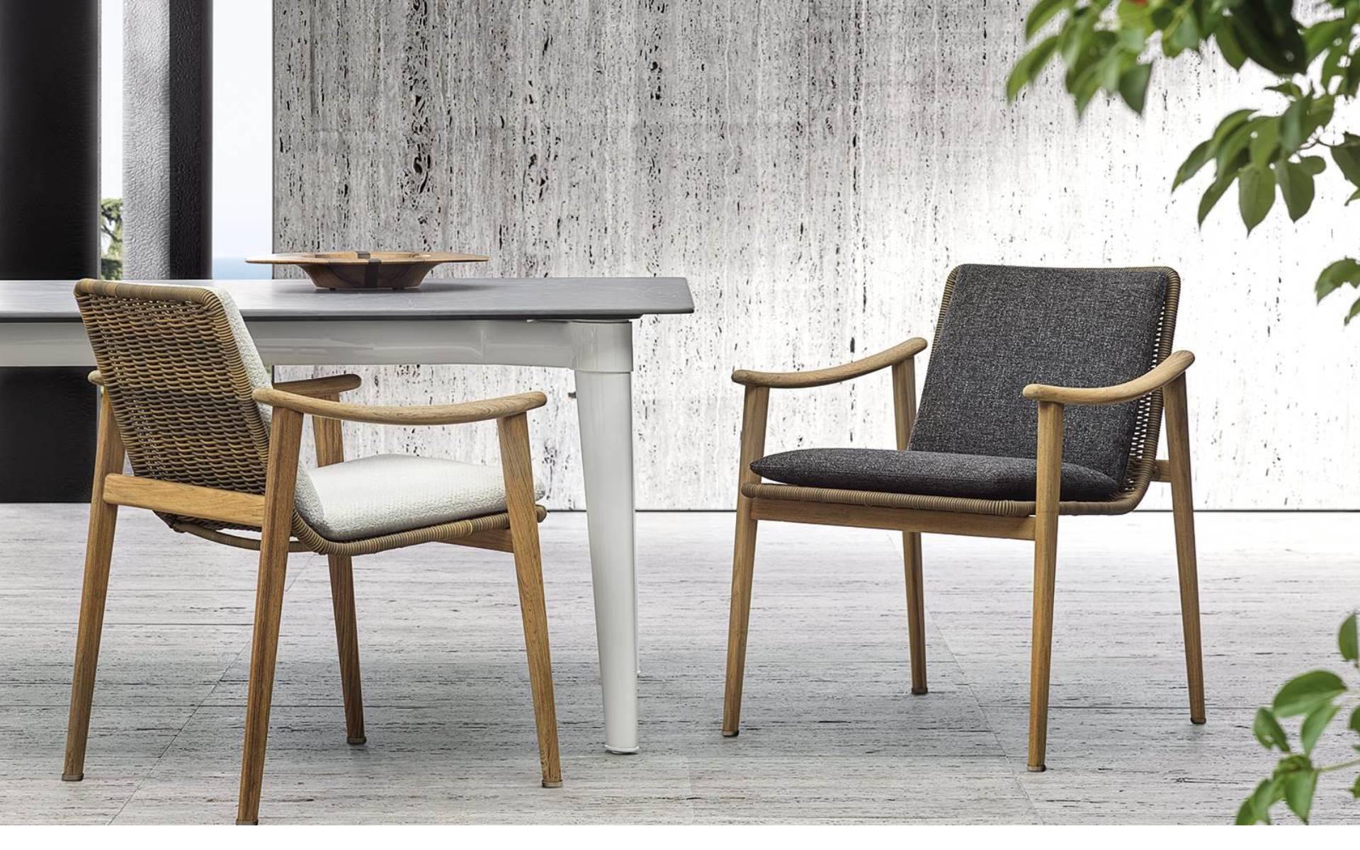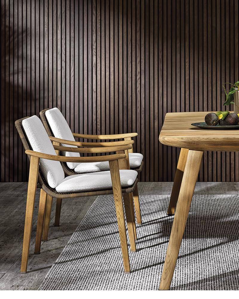 The Fynn Outdoor armchair and little armchairs feature a distinctive ultra-lightweight aesthetic with a simple structure in teak. The frame is interwoven with wicker-effect cords in Mud colour, hosting a padded seat and backrest cushion, designed as a single element. The informal rigour with which Fynn Outdoor hosts the padded element designs a comfortable seat.