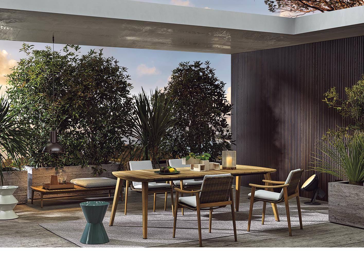 In Fynn, Scandinavian values meet Italian tradition. A contemporary design for outdoor spaces in teak wood, crafted with fine cabinet-making workmanship.