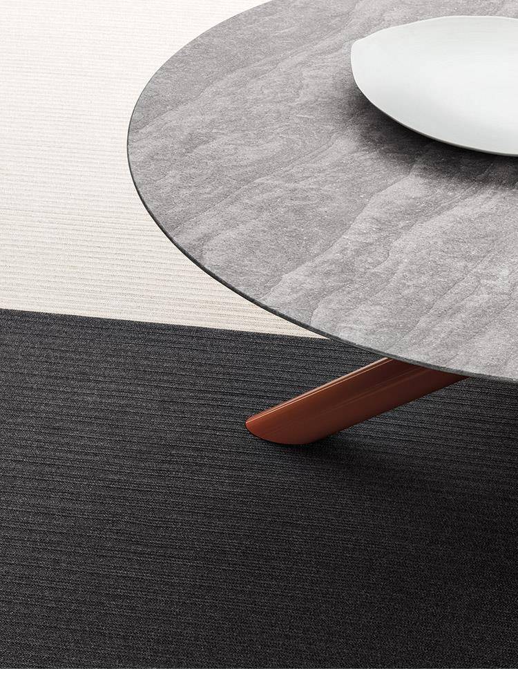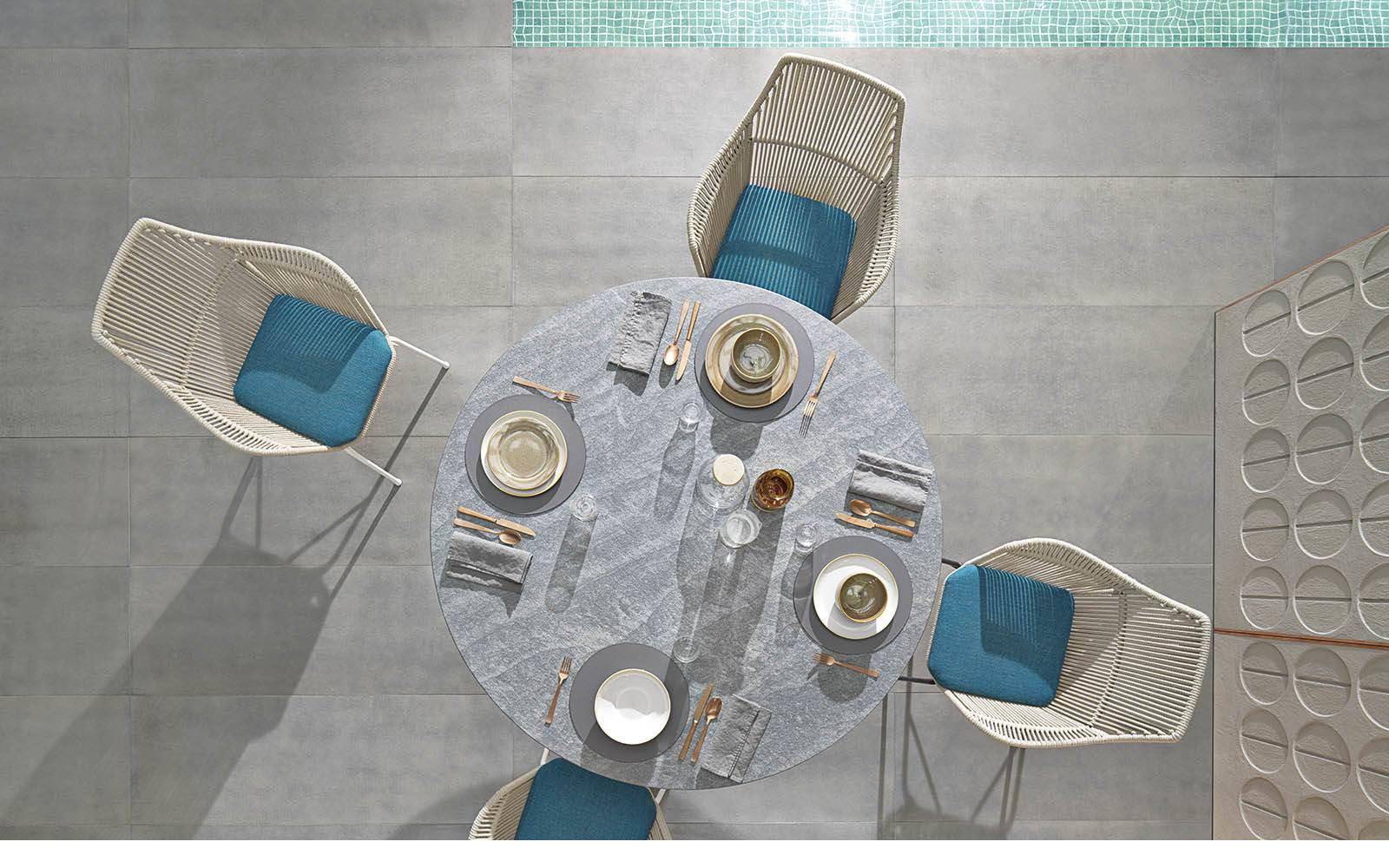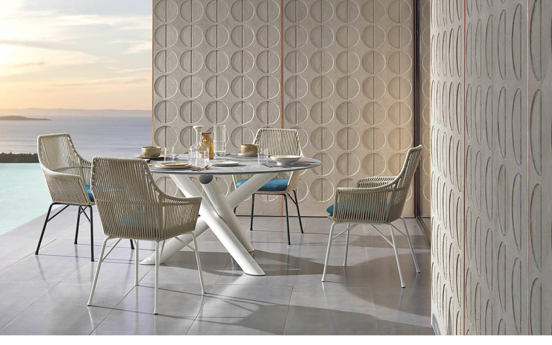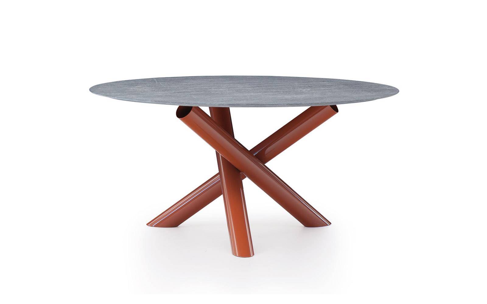 It is characterized by a sculptural base, consisting of three 10 cm diameter metal tubes welded together and painted with polyester powder for outdoor use in the Clay, Sunflower, Rust and Khaki Green colours. Enriching the colour range of the outdoor version of the iconic table, the two “orange peel” finishes in White and in glossy Pewter colour. The structure is completed by a round top in Cardoso stone or Beola Argentata. A piece of furniture with a strong personality, that can be combined with different seats, capable of giving a unique character to open-air contexts.