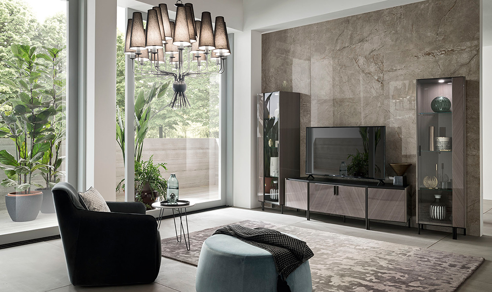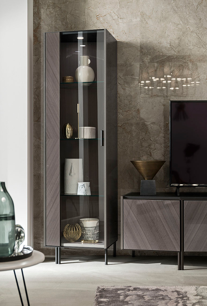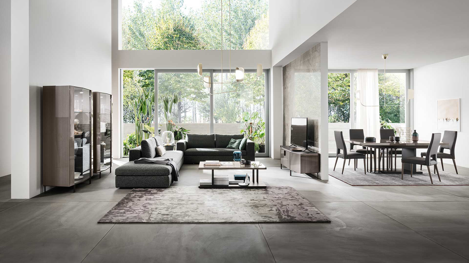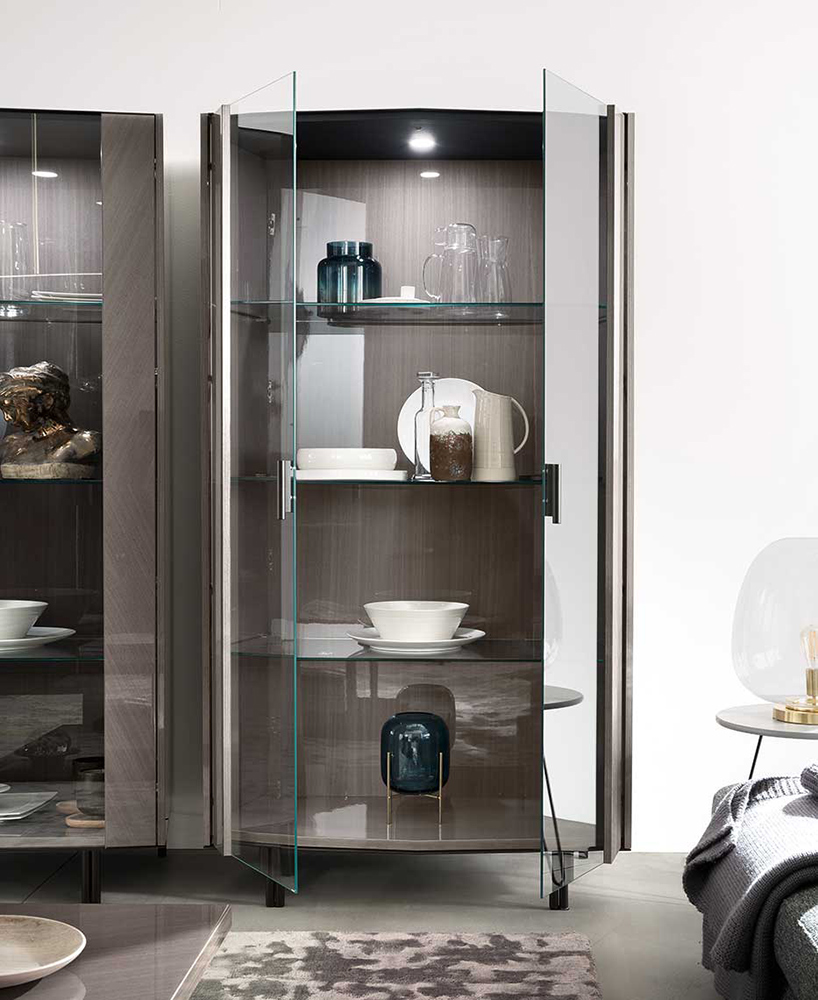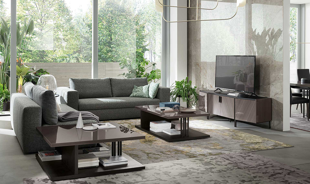 The Olimpia dining room set combines Eucalyptus Velvet High Gloss with a Mahogany matte finish to produce a sincere and welcoming atmosphere to your dining experience. The table is available in two sizes and comes with one extension leaf that can be stored easily in the base.