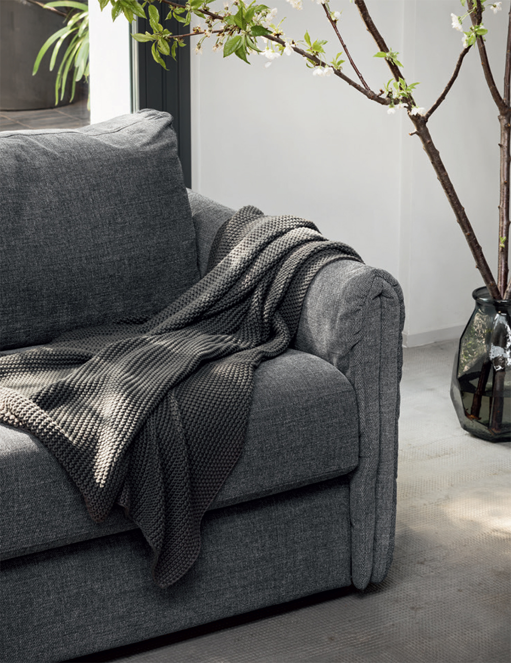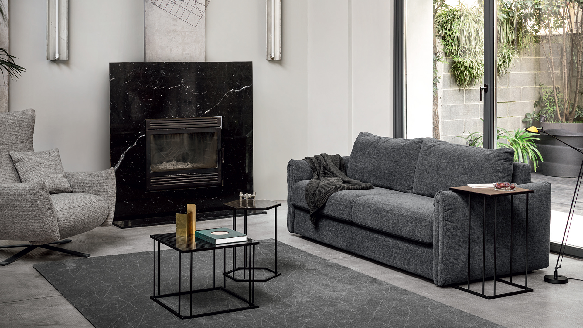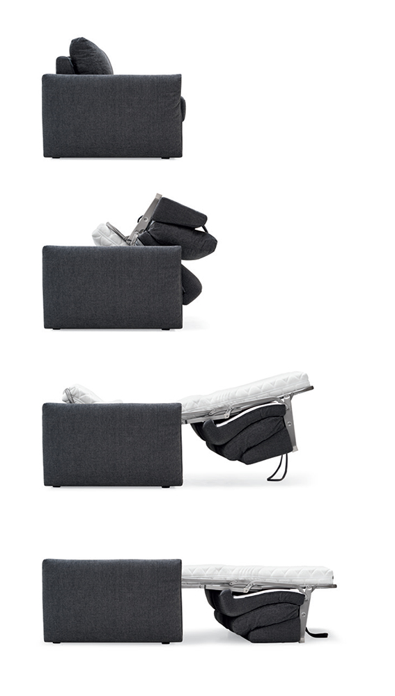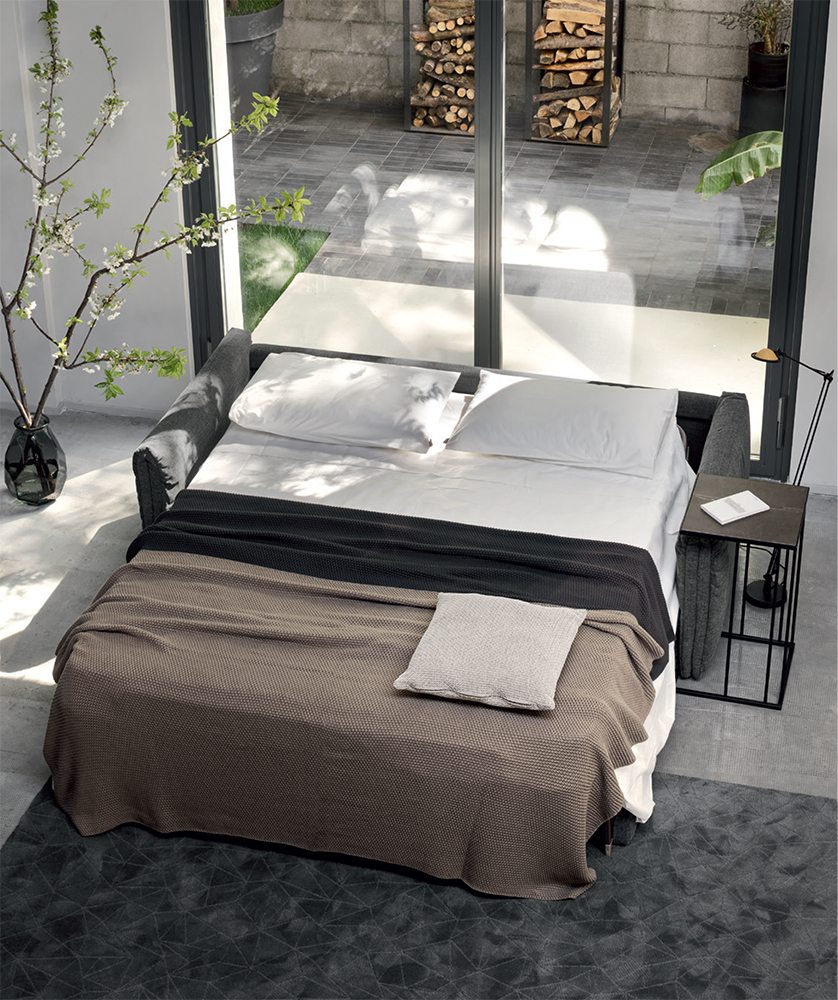 Darwin reproduces the design detail of the Landa sofa with the folded-over cushion. A stylish statement for a sofa bed that might be downsized but is definitely big on personality. It has a semi-automatic mechanism and the mattress is included. It can be easily opened up by pulling a matching band concealed by the backrest and closes again just as effortlessly without any need to move cushions or anything else.