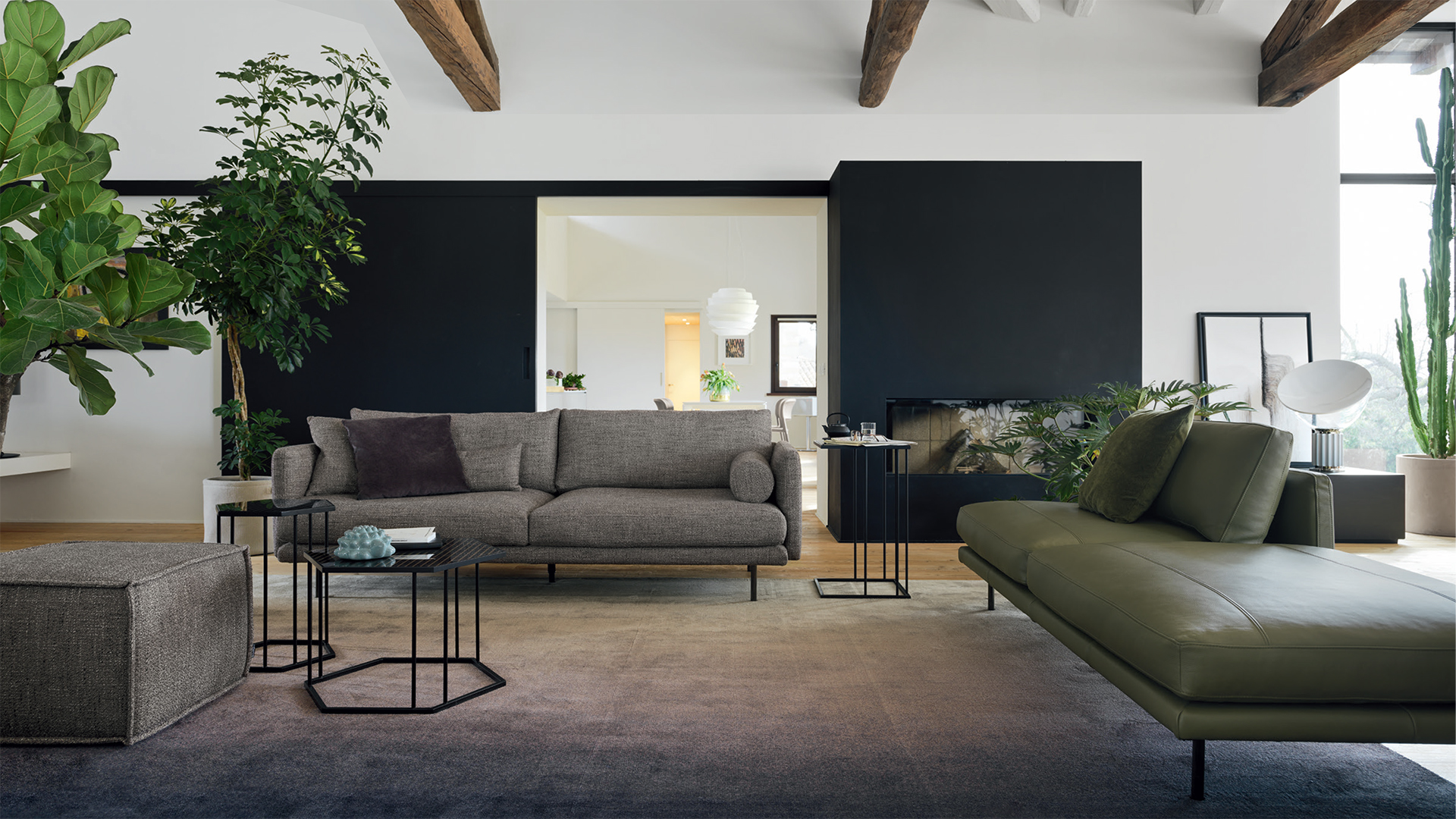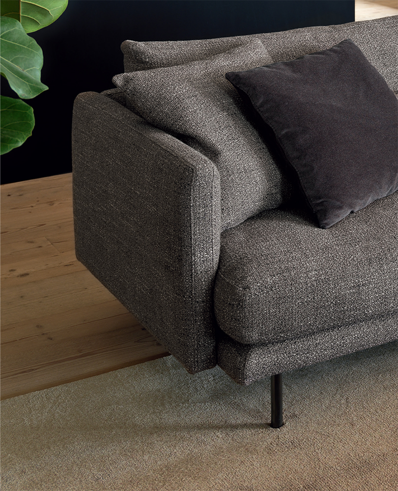 The main feature of this sofa is the possibility of customising both the optional round headrests with metal buckles or the back cushions with any fabric from the collection. Infinitely comfortable.