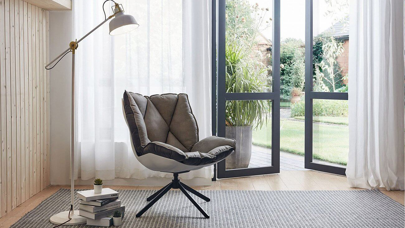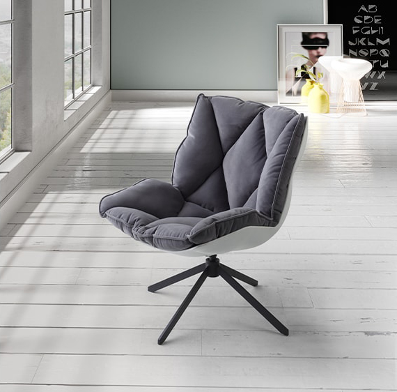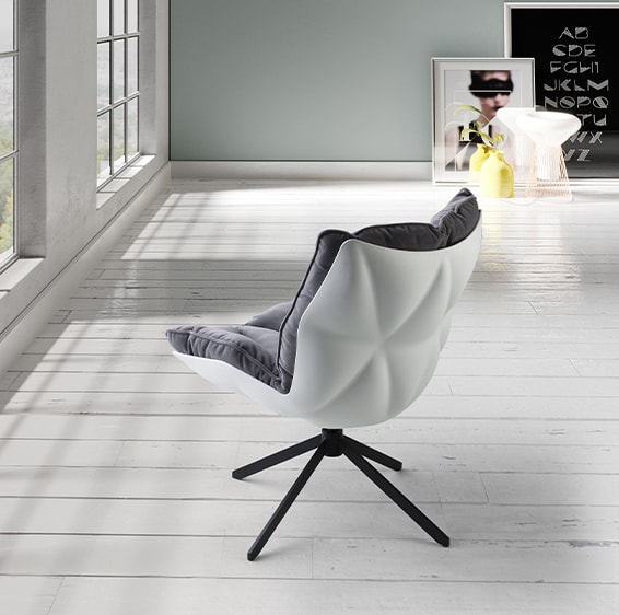 Armchair Polypropylene shell with fabric cushion and metal legs.