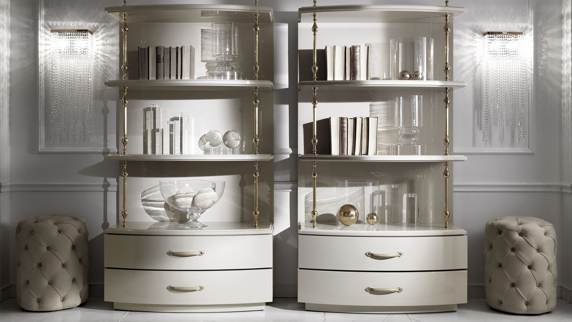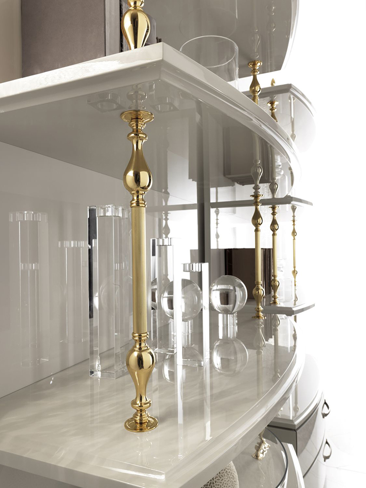 Shelving unit with three open shelves and two drawers. Decorated with figured metal columns. Other finishes are possible.