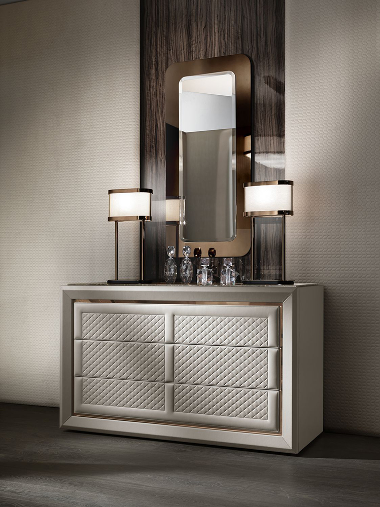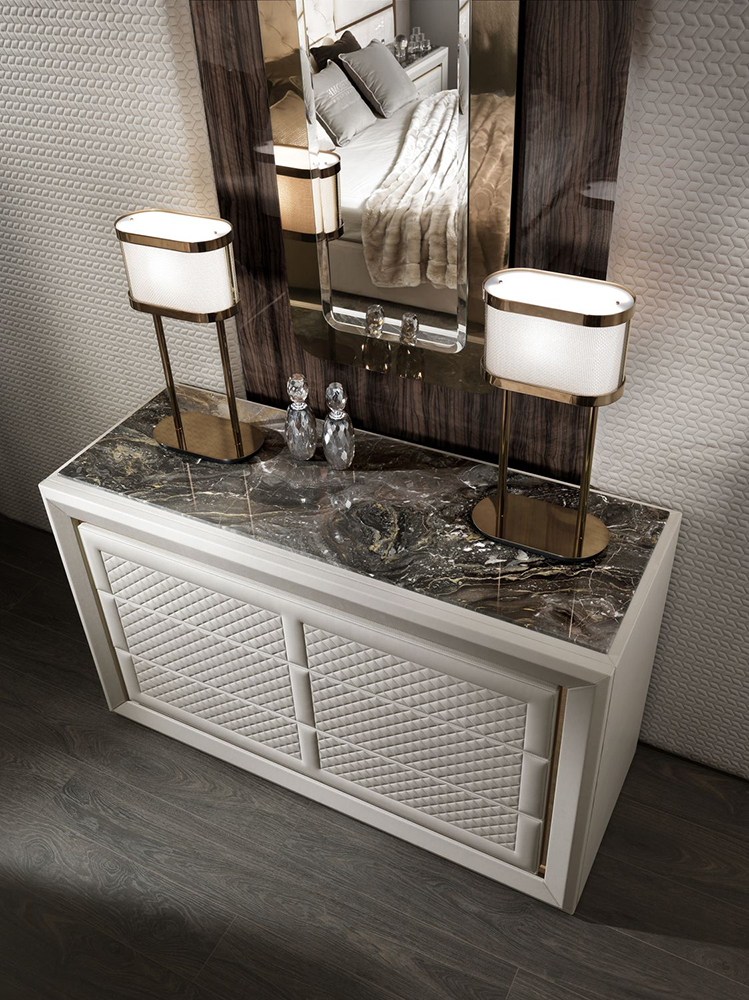 Multi-layer structure covered with leather. Internal part of a covering a opaque varnish. Metal inserts began to repeat. Table top in marble. The quilted frontal system is two-stroke.