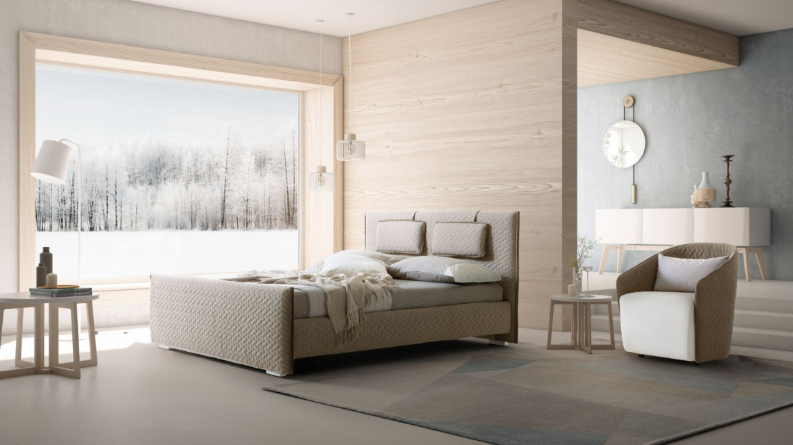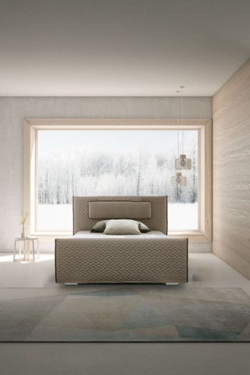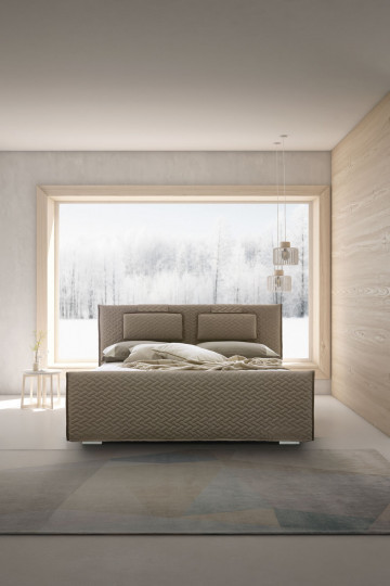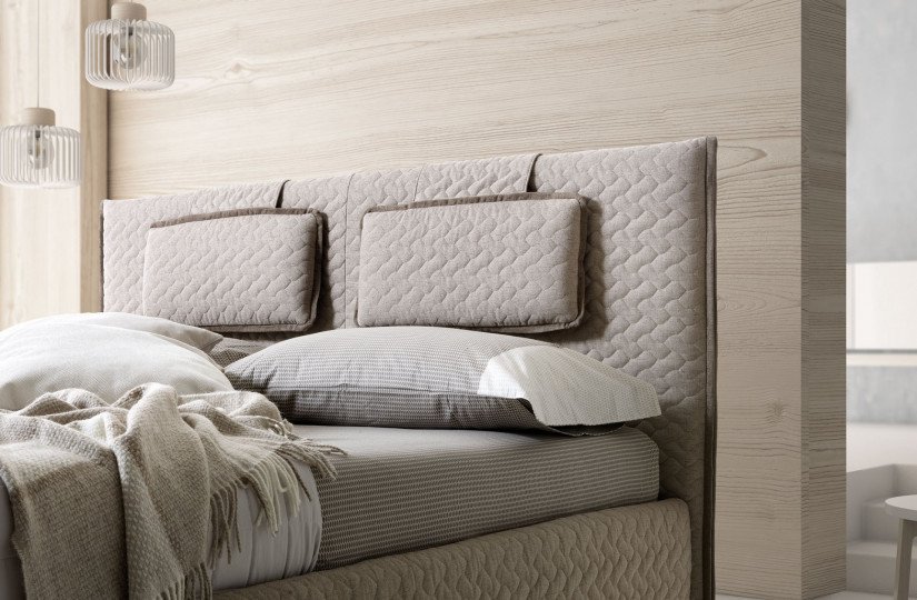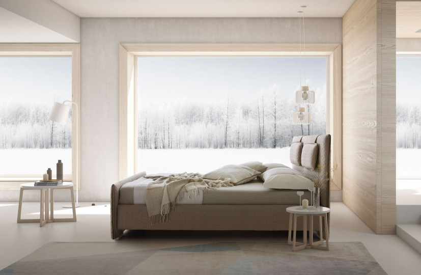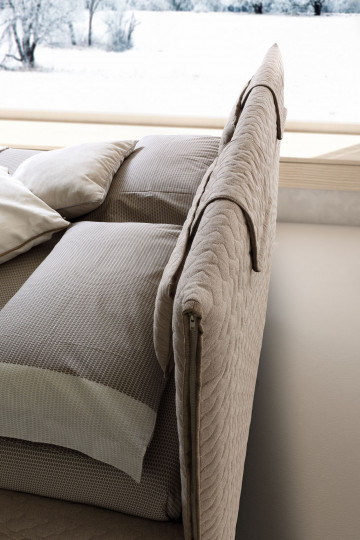 The embracing upholstery of Evergreen adheres to the spacious raised footboard with sinuous elegance. Much like a warm embroidered robe, it holds together the headboard\'s suggestive thickness, and embellishes it with a distinguishing lateral zip. Much like an outfit should, the bed is matched with accessories: these are represented by wide and comfortable pillows, which match the tall headboard. The latter is set against the secret depths of a useful storage base, whose ingenious mechanism ensures that order and tidiness will dominate the surrounding environment.
