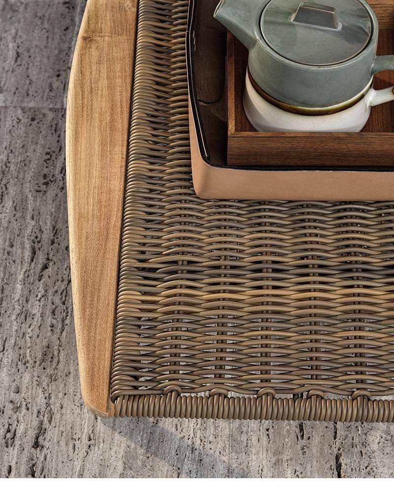 The Fynn Outdoor armchair and little armchairs feature a distinctive ultra-lightweight aesthetic with a simple structure in teak. The frame is interwoven with wicker-effect cords in Mud colour, hosting a padded seat and backrest cushion, designed as a single element. The informal rigour with which Fynn Outdoor hosts the padded element designs a comfortable seat.