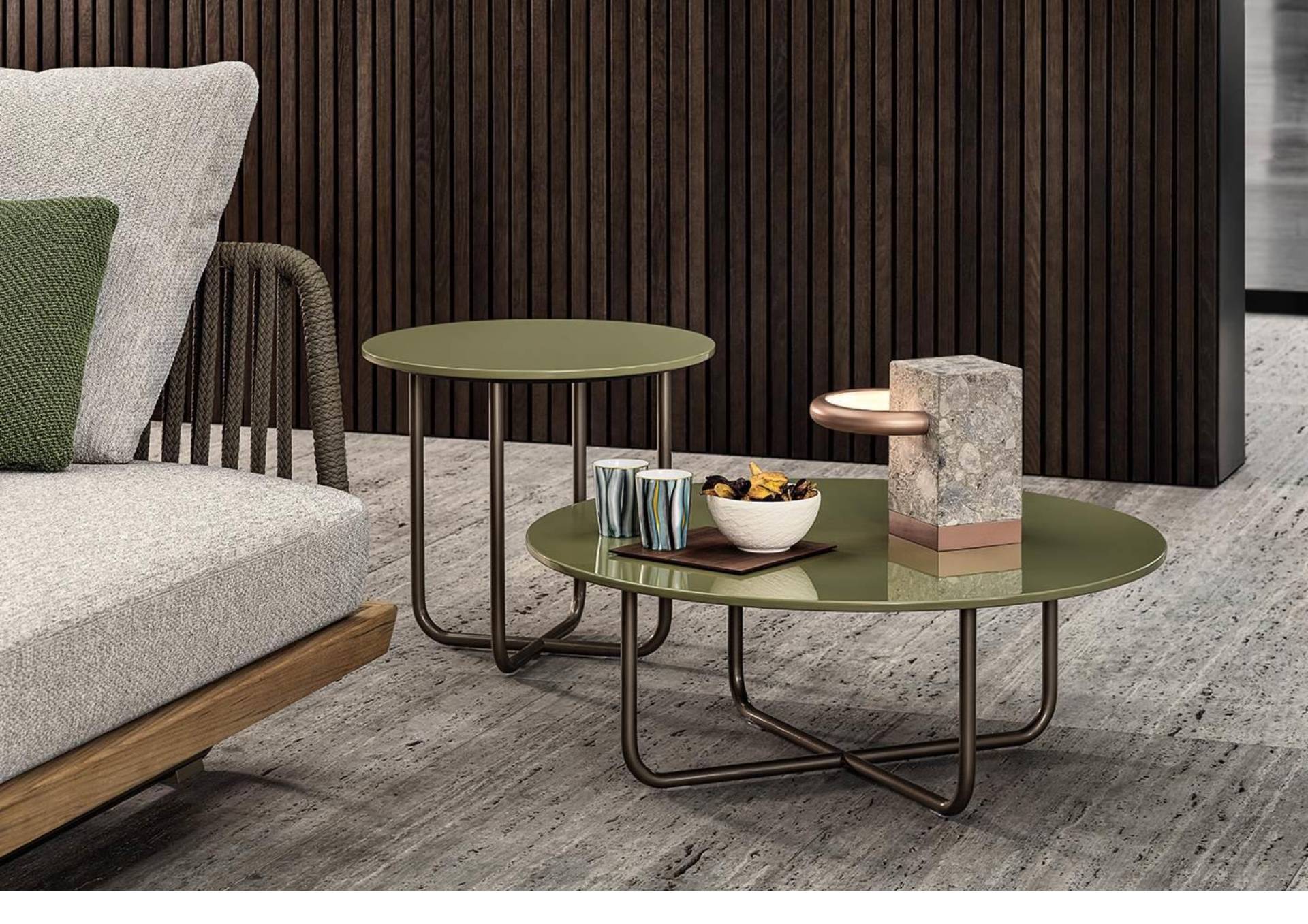 Its distinctive feature is the colour of the top in stratified HPL laminate, available in glossy lacquered White, Rust and Khaki Green finishes, blending in seamlessly with the palette of the outdoor textile collection.