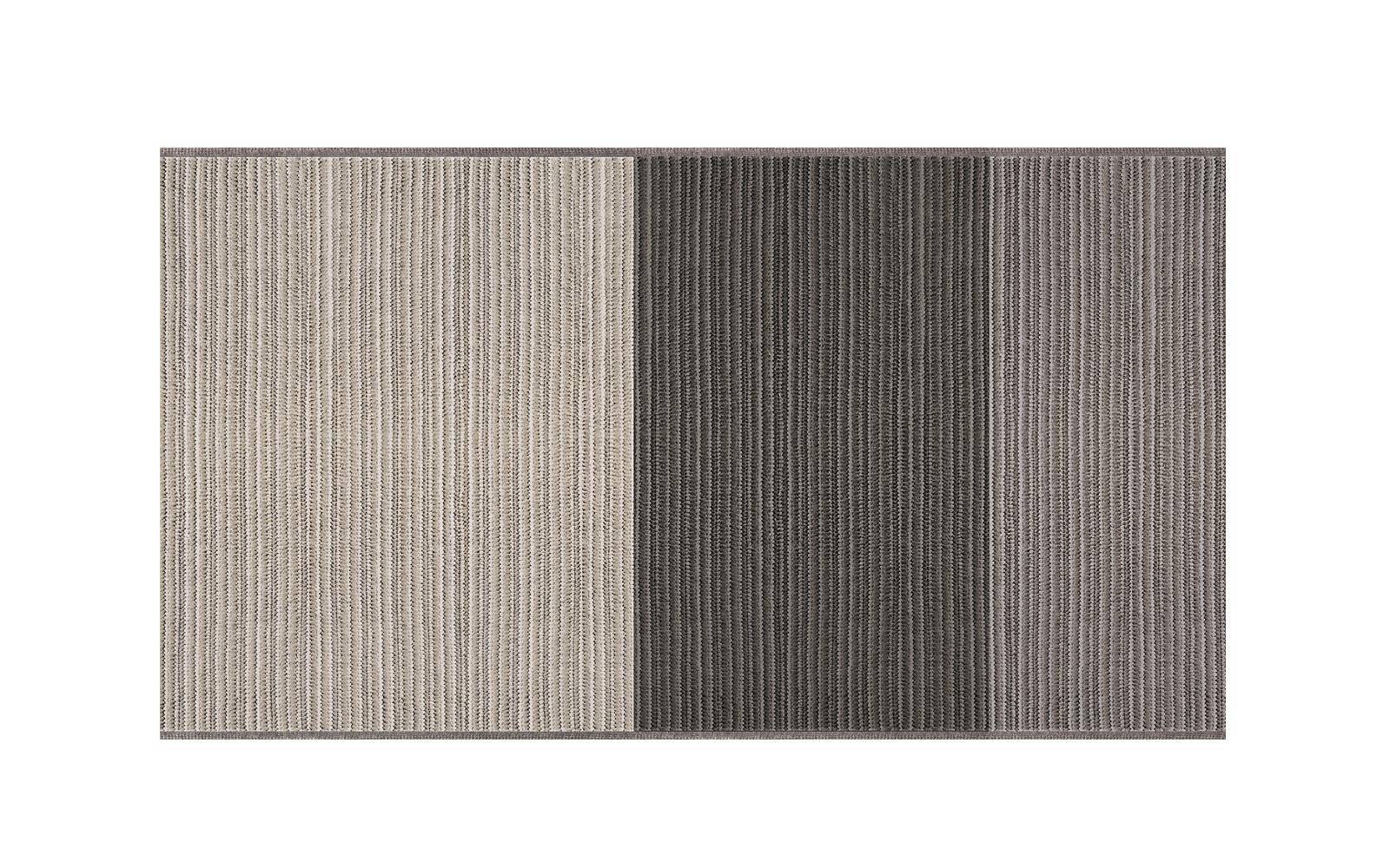 The rug has a plaited structure with a tricot effect, made of permeable, breathable acrylic yarn, making this rug truly ideal, even in humid environments. Durable, invisible stitching joins the mélange acrylic yarn plaits while the border on two sides is in a neutral grey.