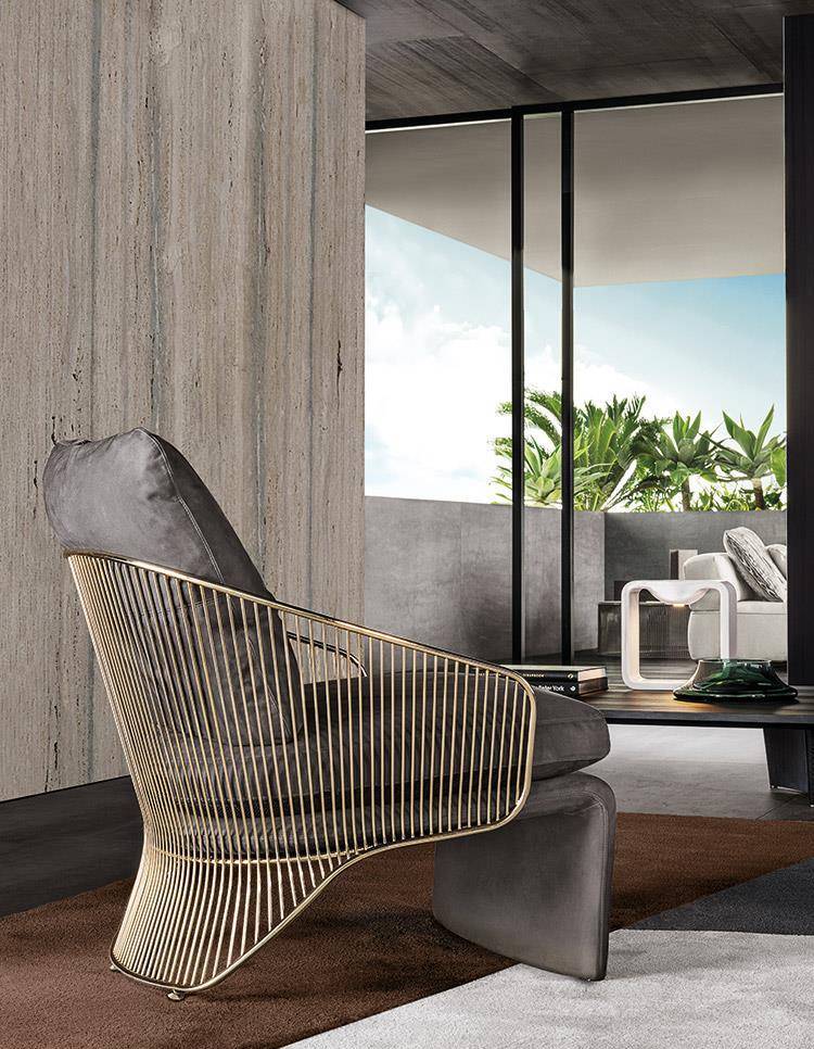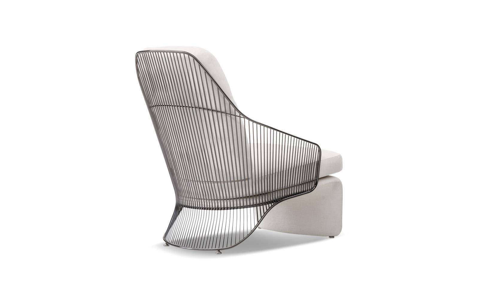 The construction of the Colette armchair is fairly complex. The profile of the external structure in metal is calendered, assembled and welded at more than 300 points. The special metallic finish is achieved through galvanization in a white-gold bath, followed by application of a transparent protective coating that lends durability and depth. The structure of the seat terminates at the front in a support structure and is made of polyurethane foam with metal insert, and elastic straps to ensure the utmost in comfort. The contoured seat cushions and seat back allow them to mold perfectly to the structure.