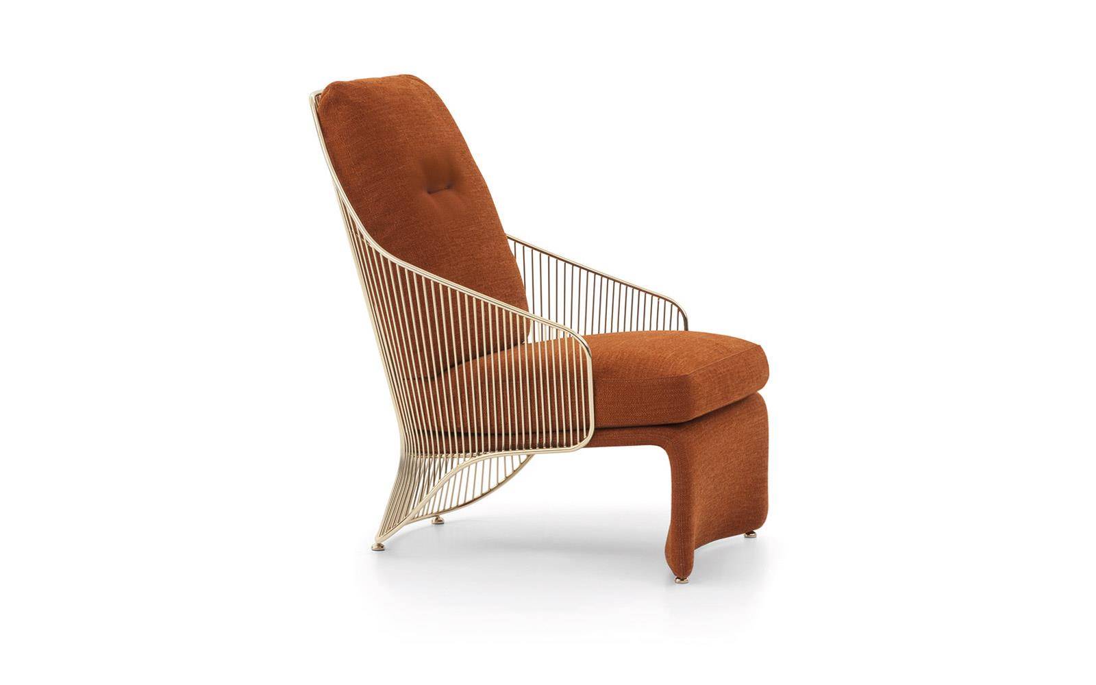 Guaranteed to turn heads, this armchair takes its inspiration from the iconic period of mid-century elegance and skillfully blends experimentation in the design of shapes with sophisticated decorative taste.