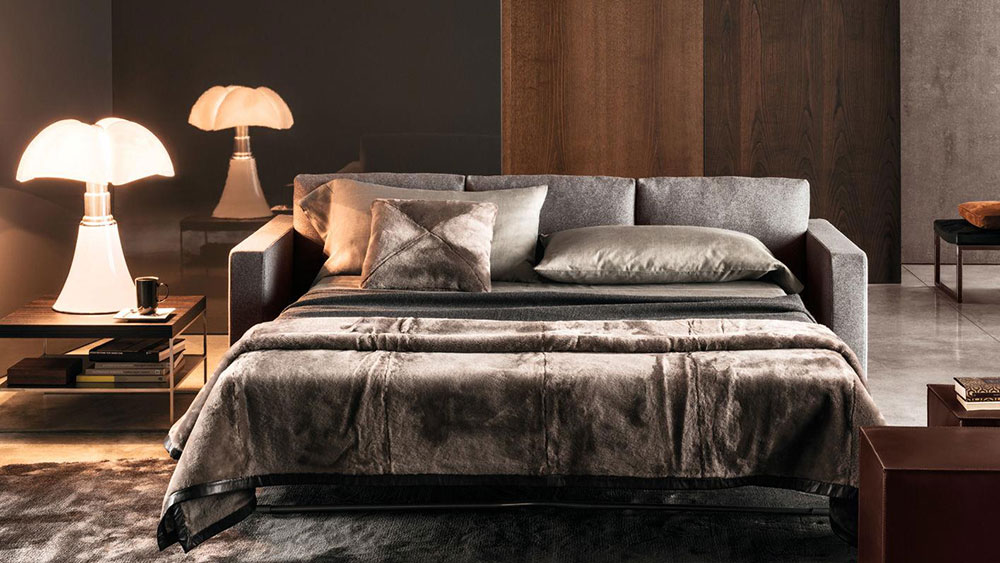 The meticulous lines of Deep Suitcase are inspired by pure design. It is distinguished by metal feet, chromed or bronze metal burnished, that contributes to its bold personality. Deep Suitcase, 98 cm deep, features soft back cushions, and is available in two- or three-seat sofa versions (also a version converting to a sofa bed).