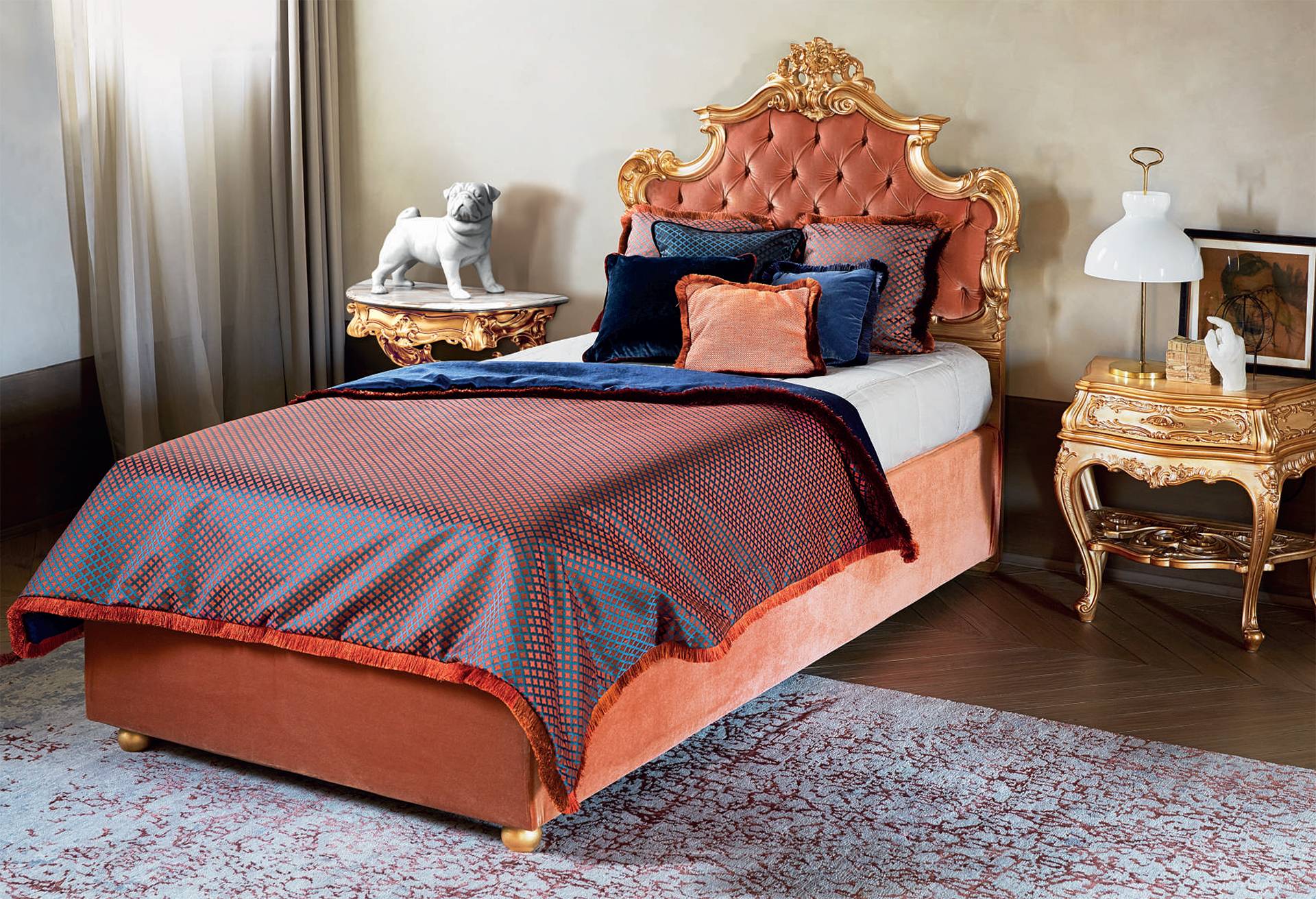 A bed in a soft headboard upholstered in fabric using the capiton technique. The base is made of wood. The frame is decorated with carvings and gilding. There are several options for the implementation of the base and legs.
