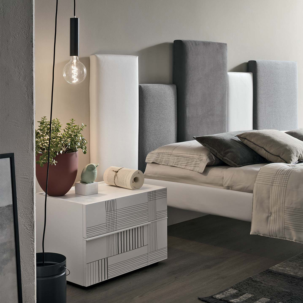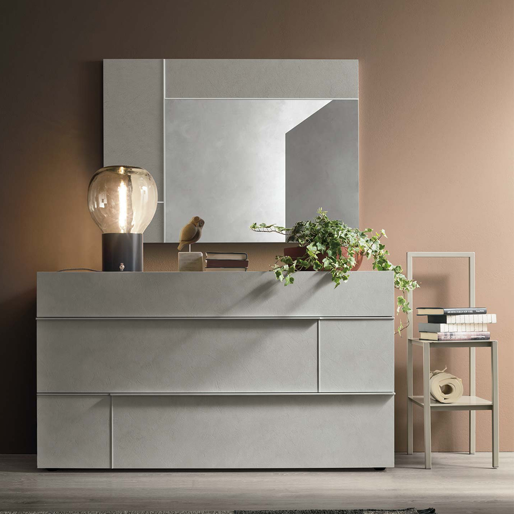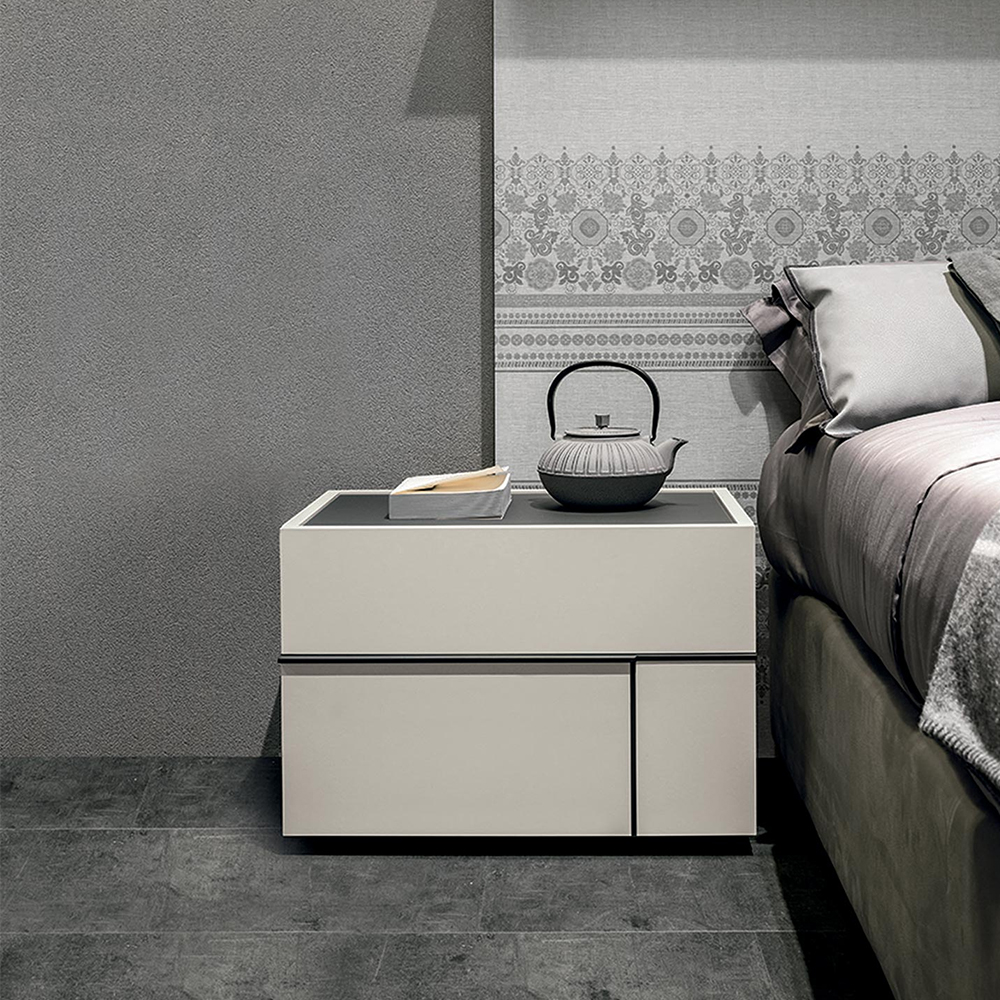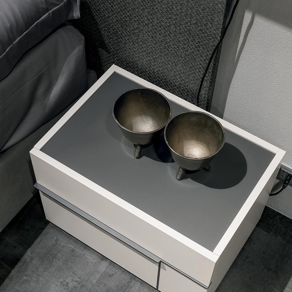 Hashtag bedside units in textured matt mother of pearl with satin anthracite 460 glass tops. Matt anthracite 160 grip edges.Hashtag mirrors in textured matt mother of pearl with matt anthracite 160 lacqueredtrims and silver mirror.