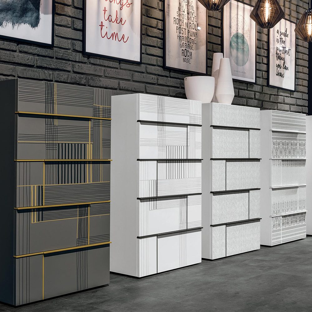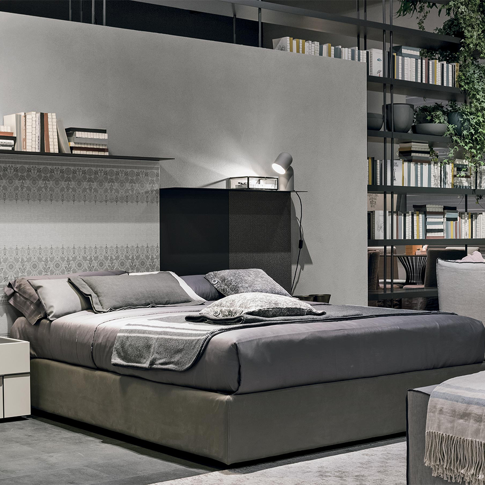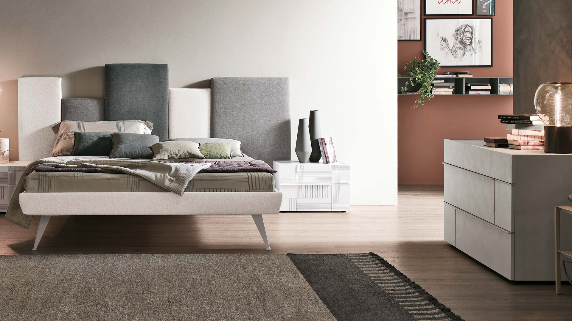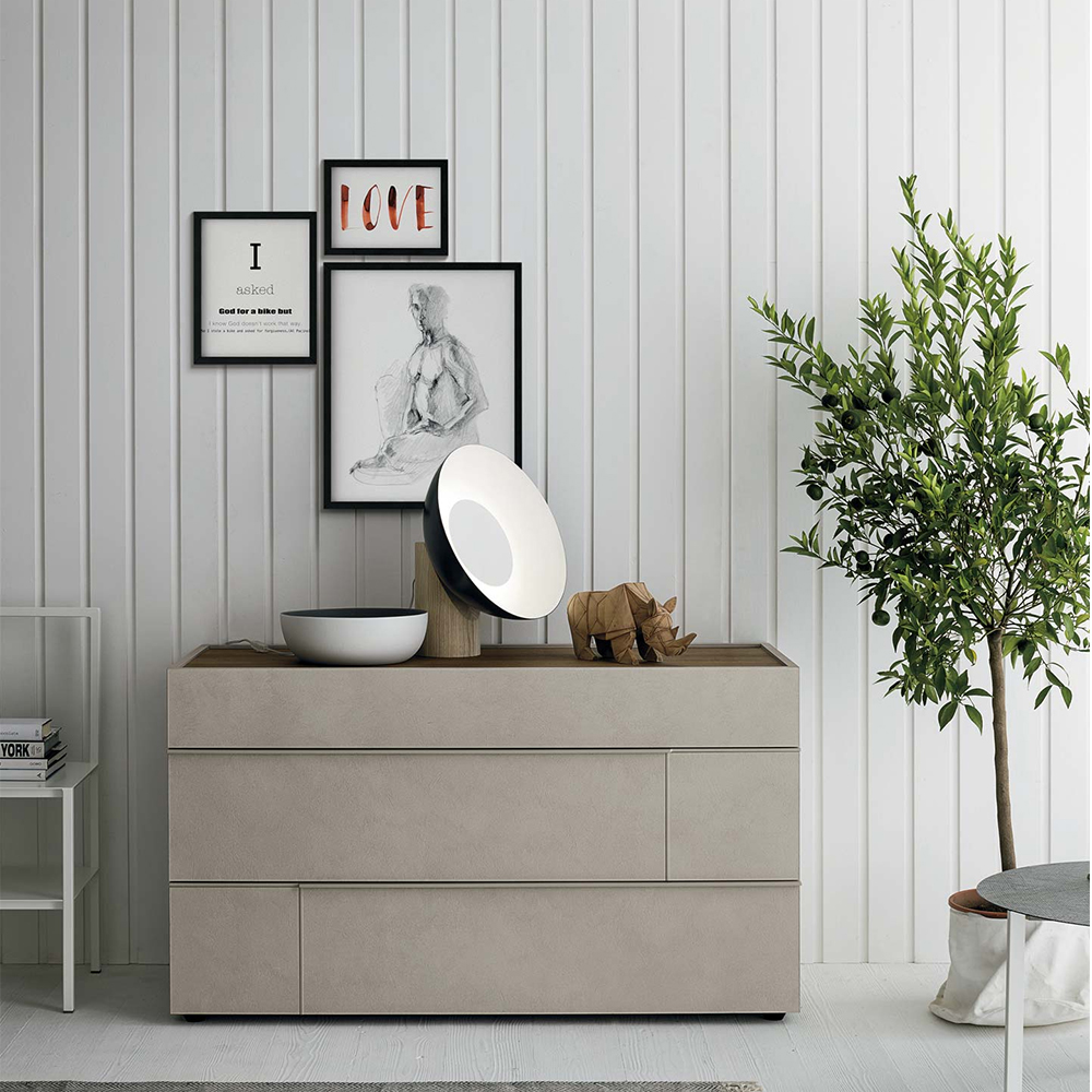 Hashtag bedside units in textured matt mother of pearl with satin anthracite 460 glass tops. Matt anthracite 160 grip edges.Hashtag mirrors in textured matt mother of pearl with matt anthracite 160 lacqueredtrims and silver mirror.