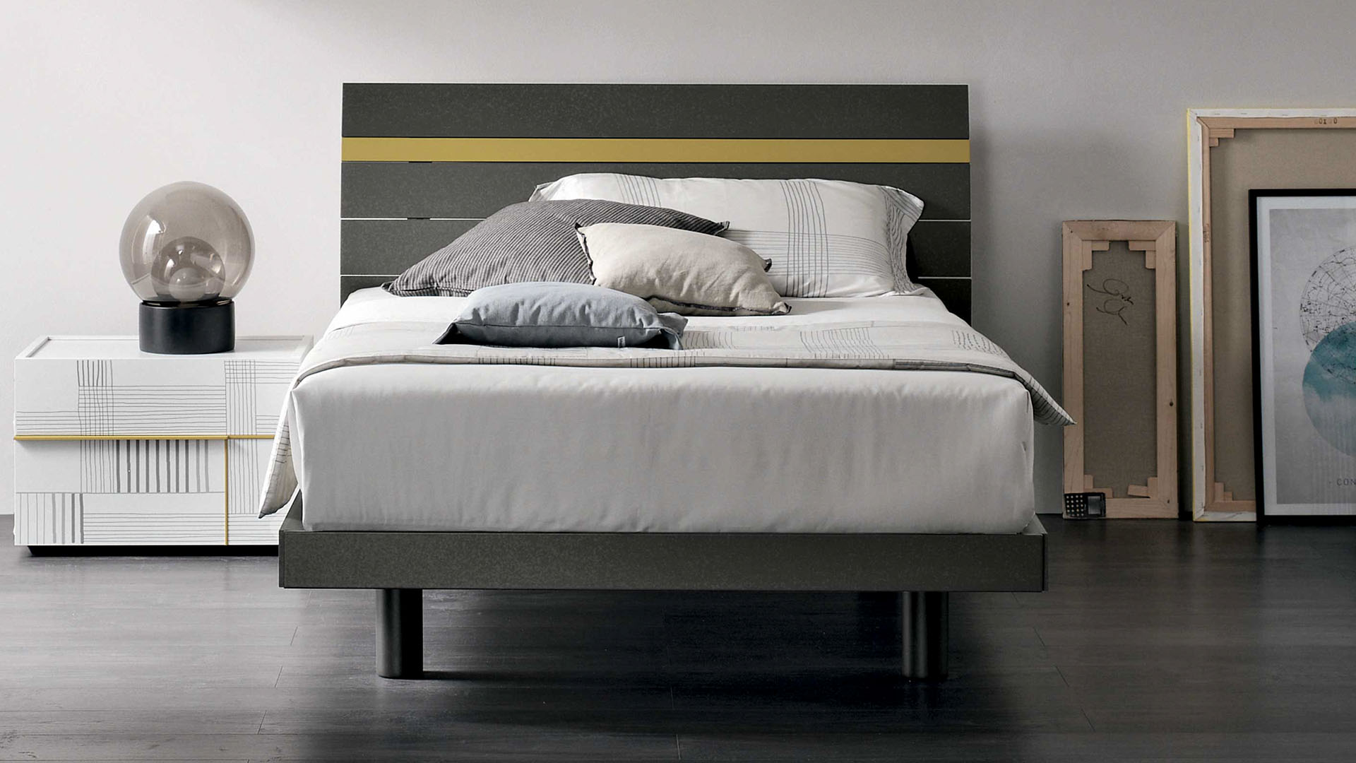 Bed with textured inserts that can be easily customized. Available in various sizes, with a storage unit.