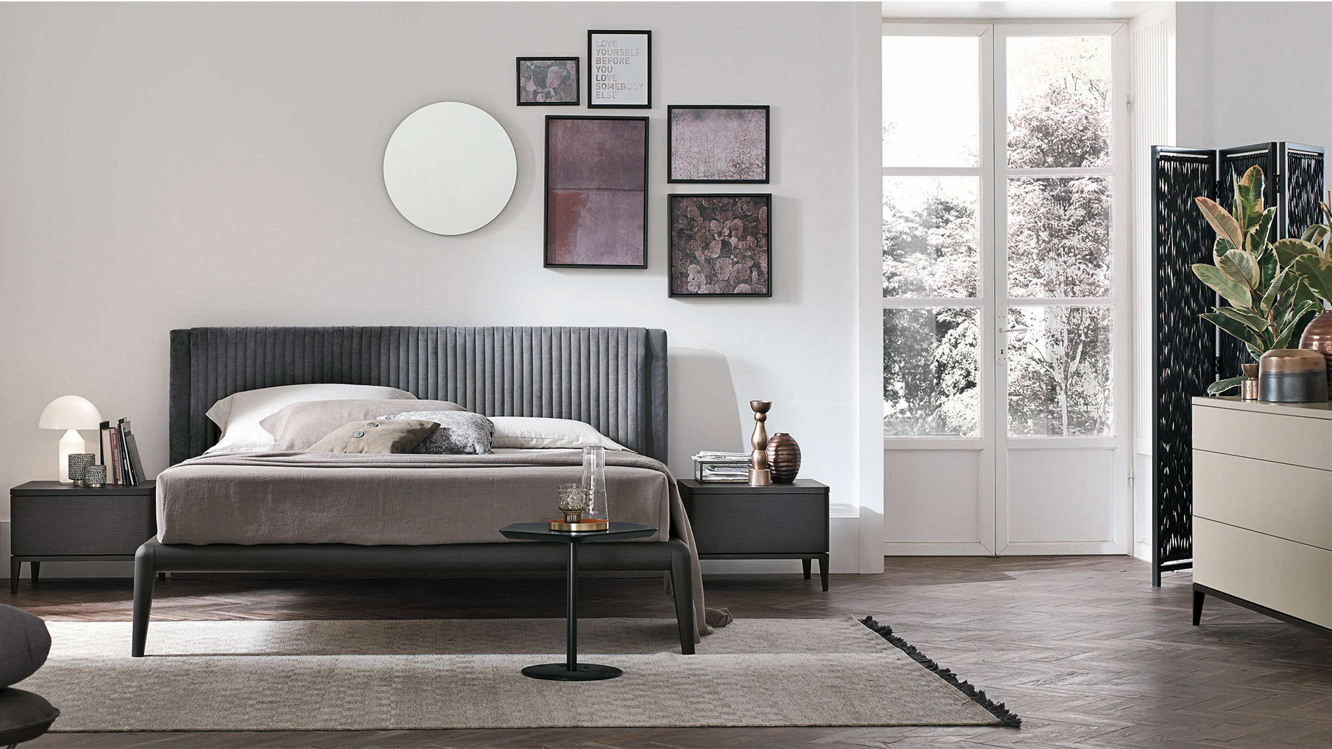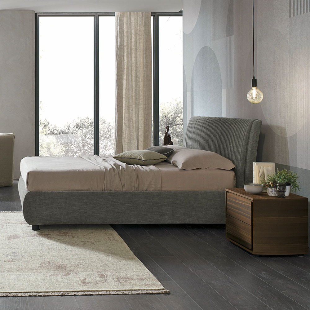 An upholstered headboard decorated with original, decorative, vertical stichtings: this bed combines the unusual ribbing on the headboard with a carefully-crafted bed frame. Style and materials are both in perfect harmony.