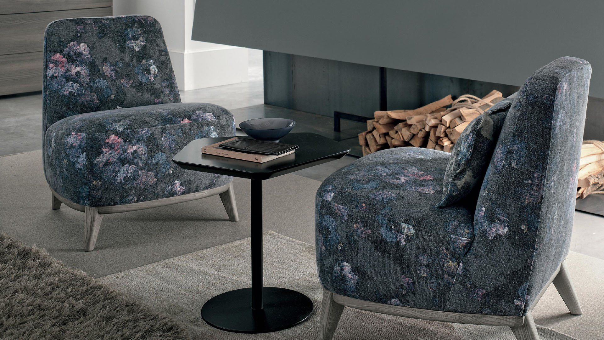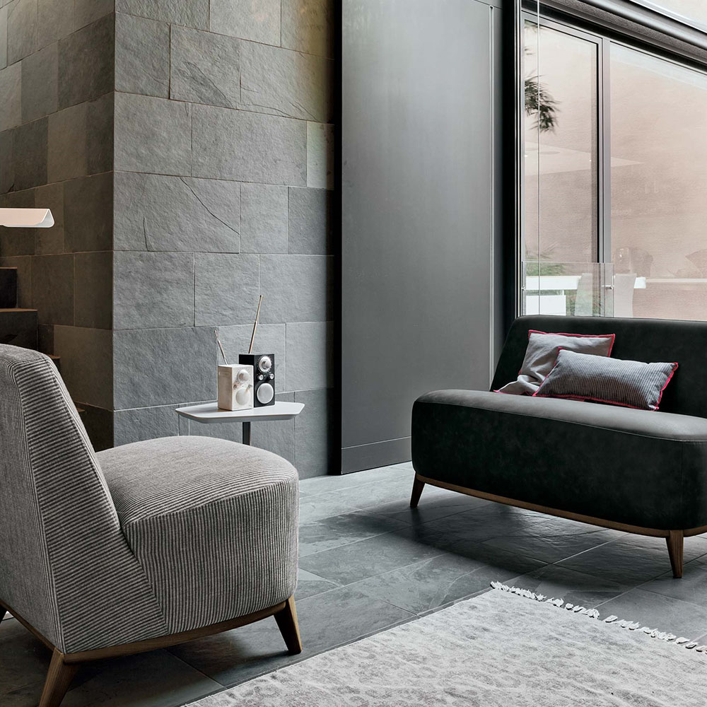 Loft is an armchair with compact dimensions that conquers with its soft lines and its retro-inspired design, enhanced by the oblique wooden feet! Simple and versatile, the seat can be combined with the armchair and sofa of the homonymous collection!