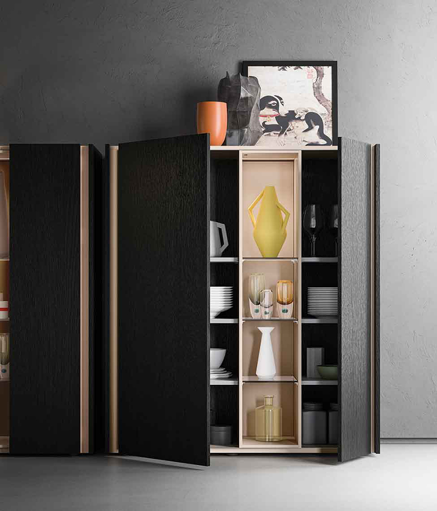 Da-Do is a living room range which includes TV units, cabinets and sideboards, which can be free-standing with feet or metal legs, or wall-mounted. Da-Do is highly customizable thanks to the two matching finishes: one for the exterior and one for the top and groove, which acts as a handle grip. An open-fronted compartment with a contrasting finish is also available.