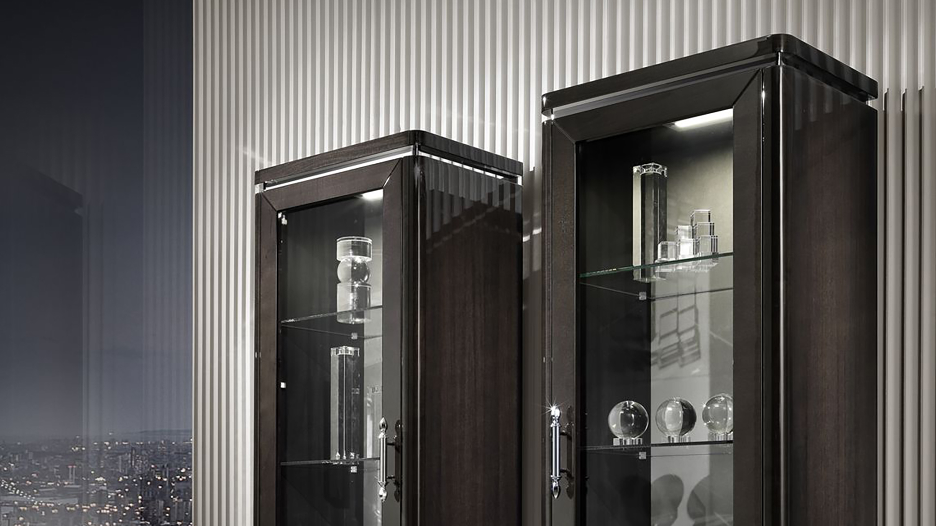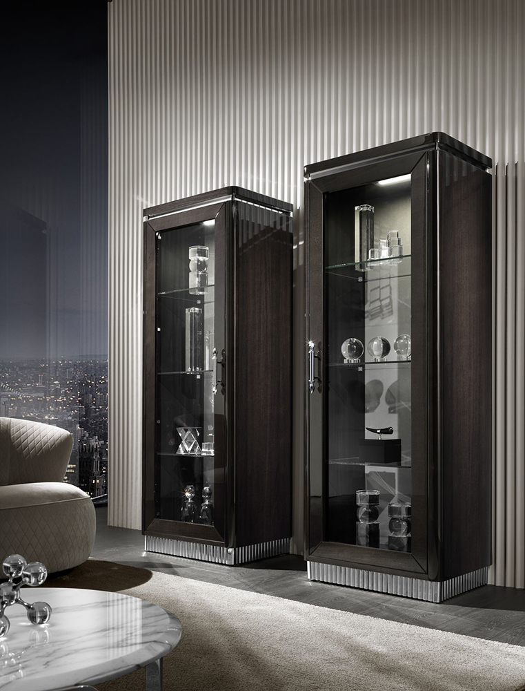 Showcase with hinged glass door. Equipped with lighting and three glass shelves. The legs are made of metal. The door can open to the right or left. Other finishes are possible.