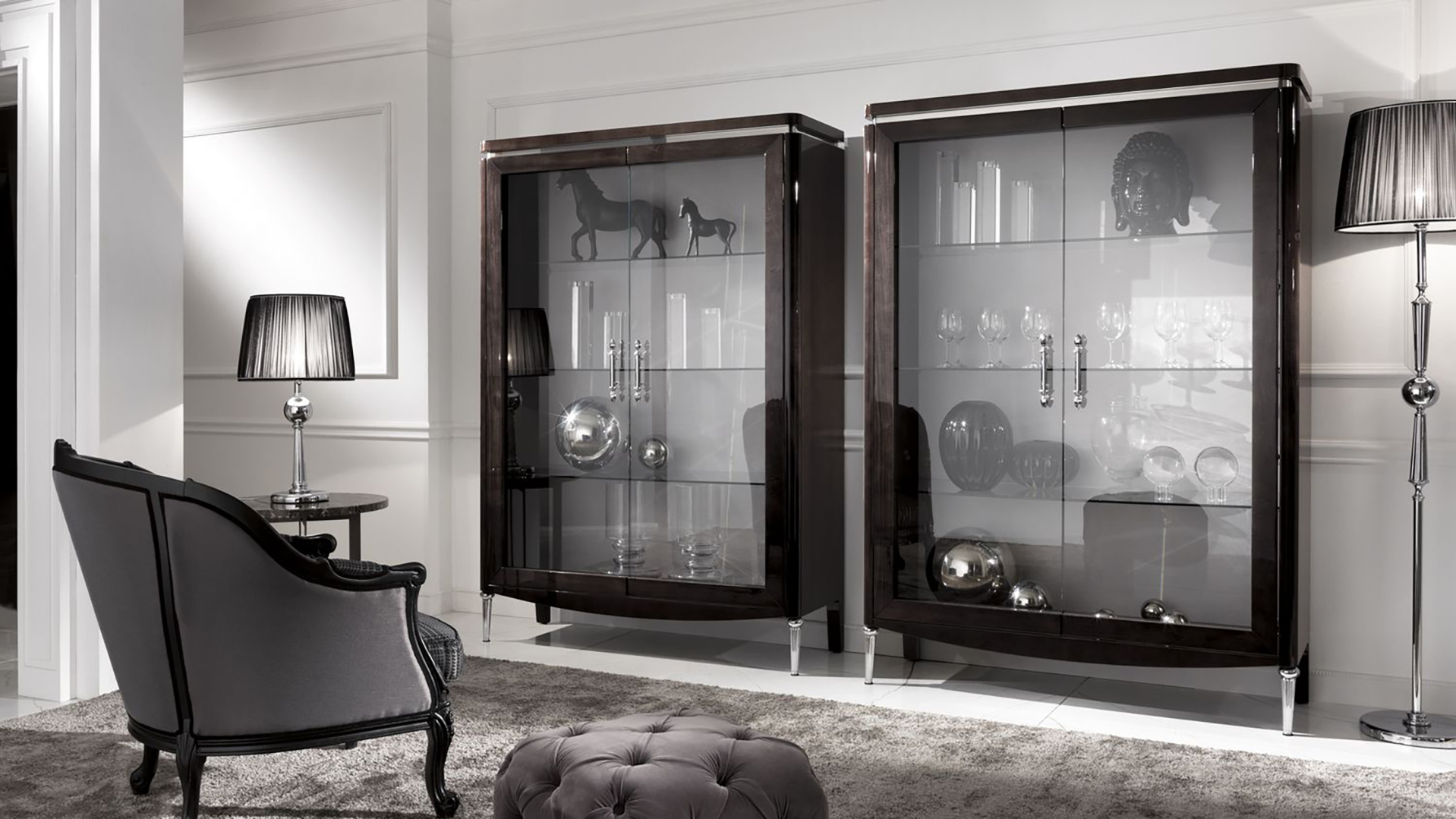 Showcase with two hinged glass doors. Equipped with lighting and three glass shelves. The legs are made of metal. Other finishes are possible.