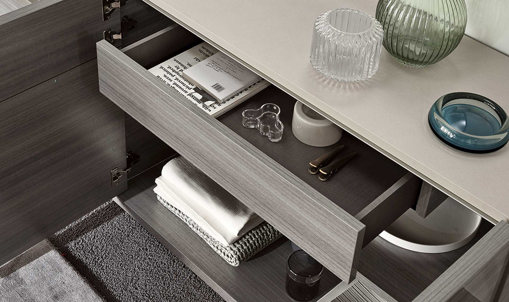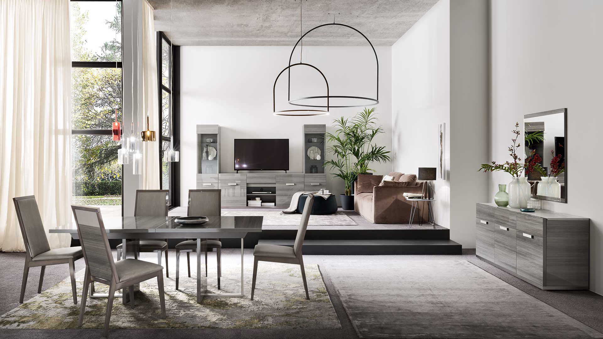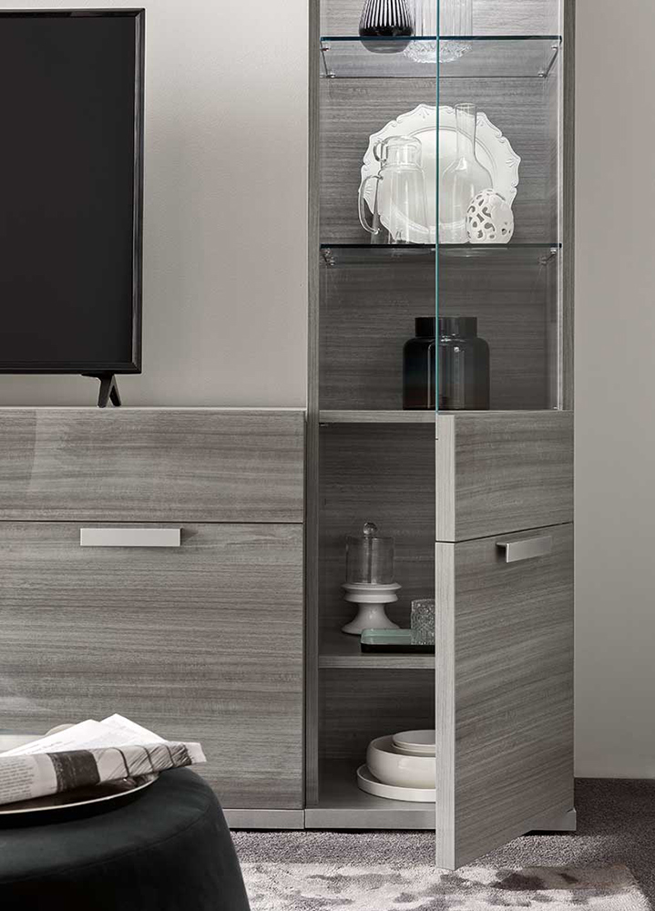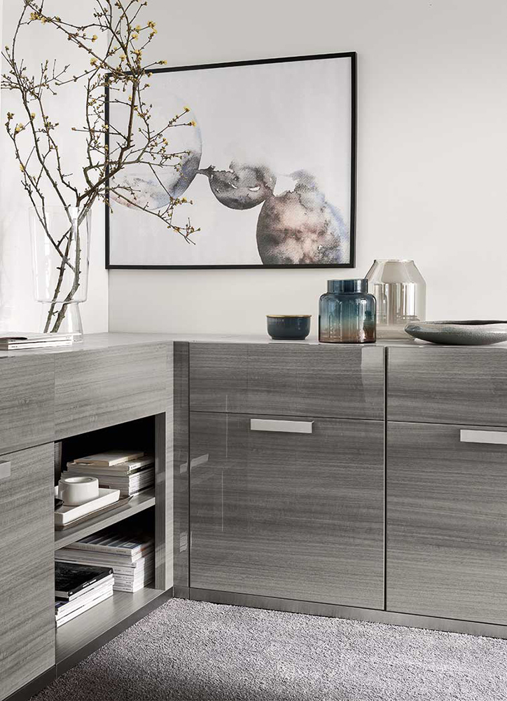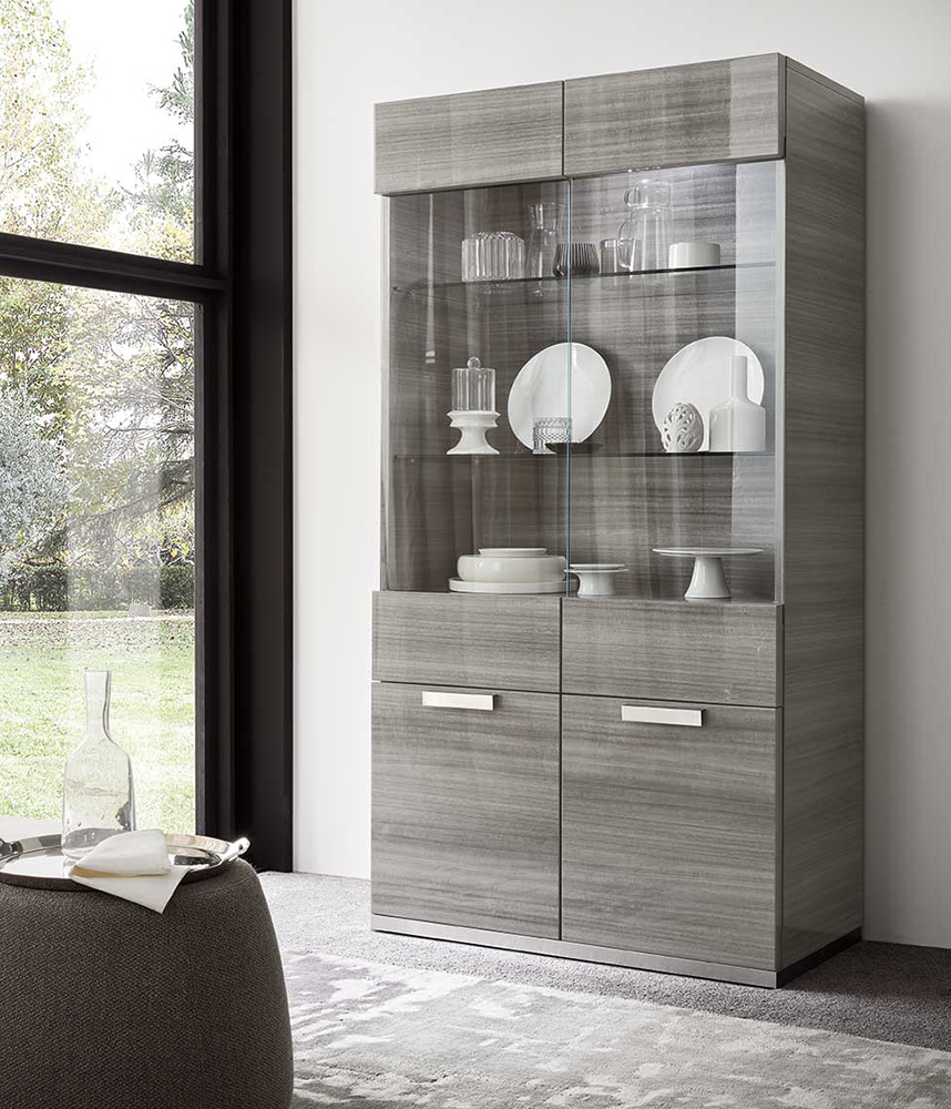 This elegant dining collection demands attention with its Eucaly Grey High Gloss lacquer. Dining Table is available in two sizes, both come with an extension that hides under the tabletop. Chairs are upholstered in premium eco-leather. Iris Dining Room Collection includes buffets in two configurations; 2-door and 3-door. mirror, 2-door curio, bookcase (with optional door), and corner units in left and right options, that brings the collection together.