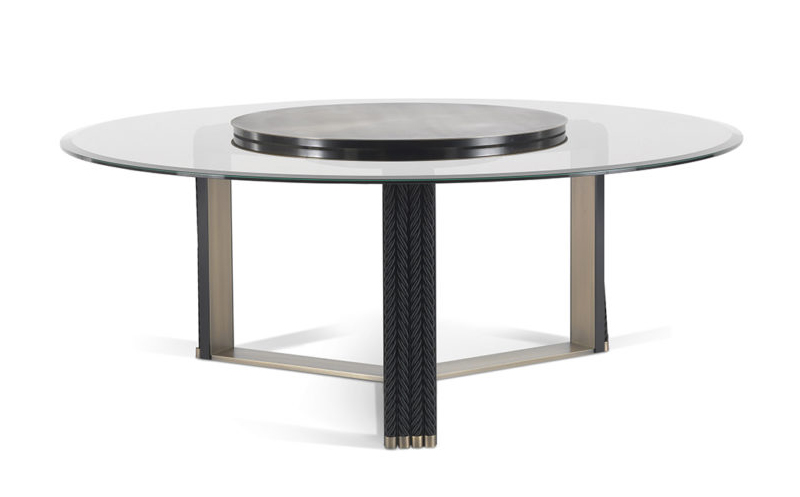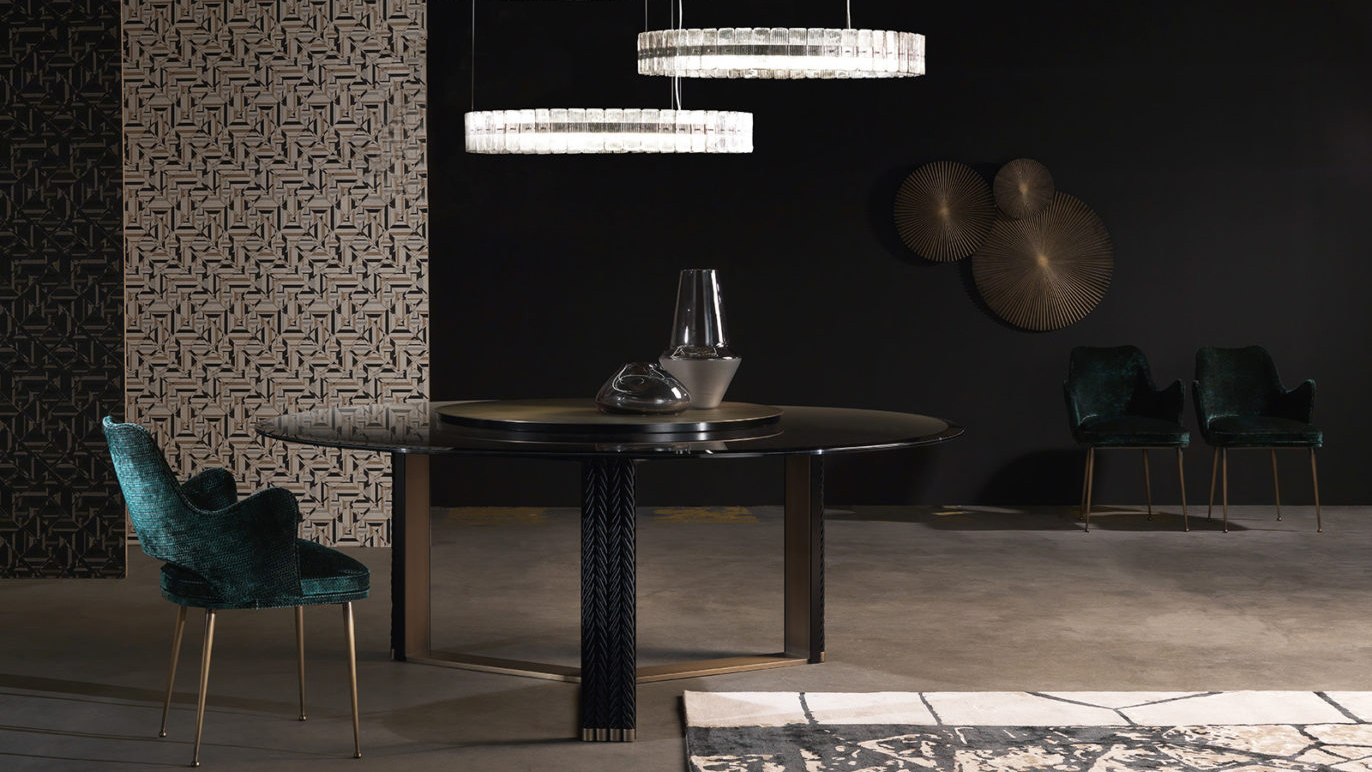 Protagonist of the dining room, the imposing Glasgow table has a coupled and ground bronzed glass top, anchored to a brass disc and equipped with removable Lazy Susan. The unique base in bronzed brass consists of a single piece structured on three legs and is externally covered in wood to accommodate the trajectory of the decorative strings. A scenographic and impactful set for a Gianfranco Ferré Home style dining room.