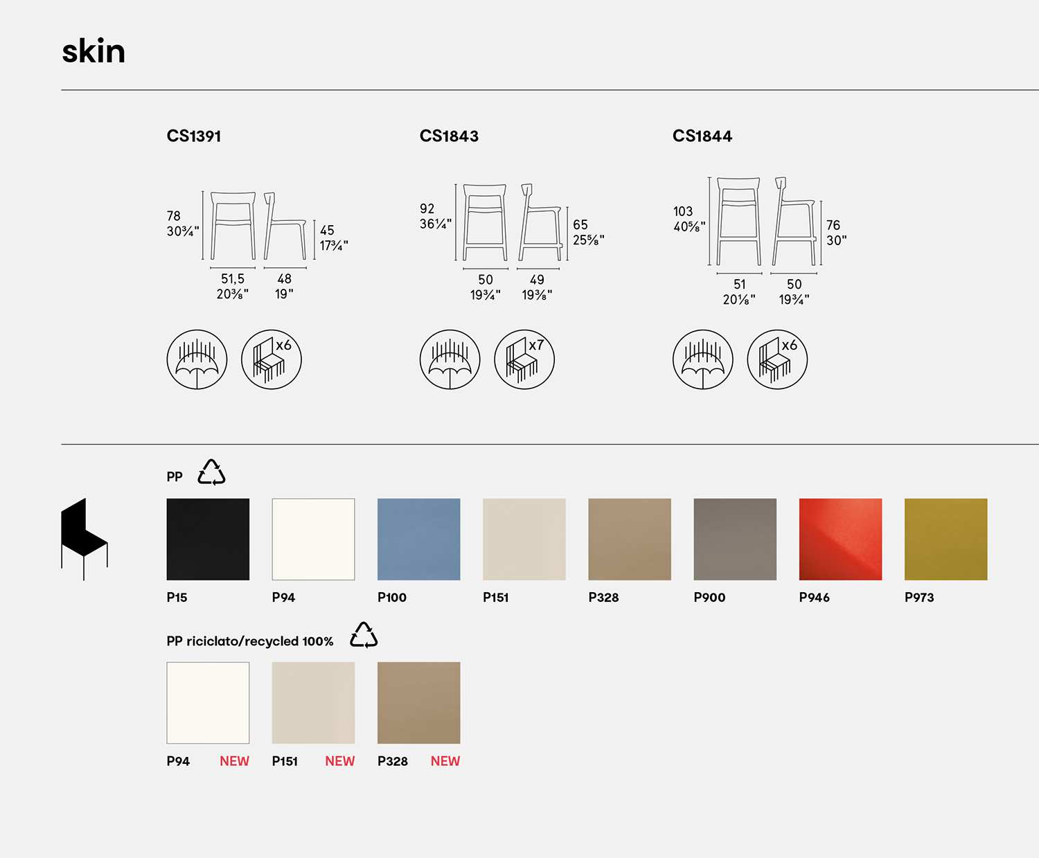 Մաքուր և որոշիչ դիզայնի գծեր՝ Skin բազկաթոռը ստեղծված է Airmoulding տեխնոլոգիայով: Այս գործընթացը ապահովում է բացառիկ ուժ և զգալիորեն նվազեցնում է արտադրանքի քաշը: Ոտքերը հագեցված են պլաստմասե բարձիկներով հատակի մակերեսը պաշտպանելու համար: Մոդելը պատրաստված է պոլիպրոպիլենից և կարող է օգտագործվել դրսում, իսկ Skin բազկաթոռը կարող է պատրաստվել նաև կենսանյութից՝ պոլիմերի և հաճարի կամ կոկոսի բեկորների խառնուրդ։