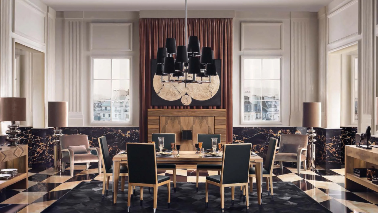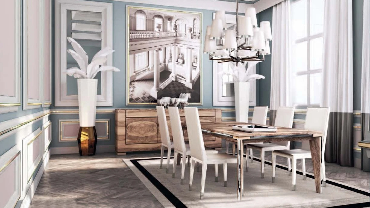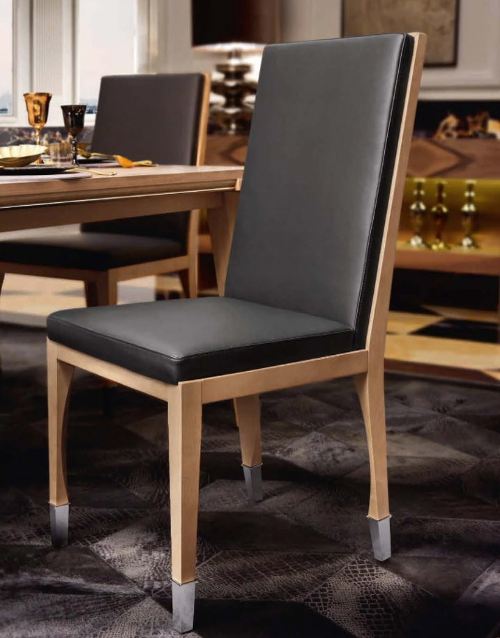 Ճաշի աթոռ փայտե շրջանակի վրա՝ բարձր ուղղանկյուն հենակով, կաշվից կամ տեքստիլից պաստառապատված։