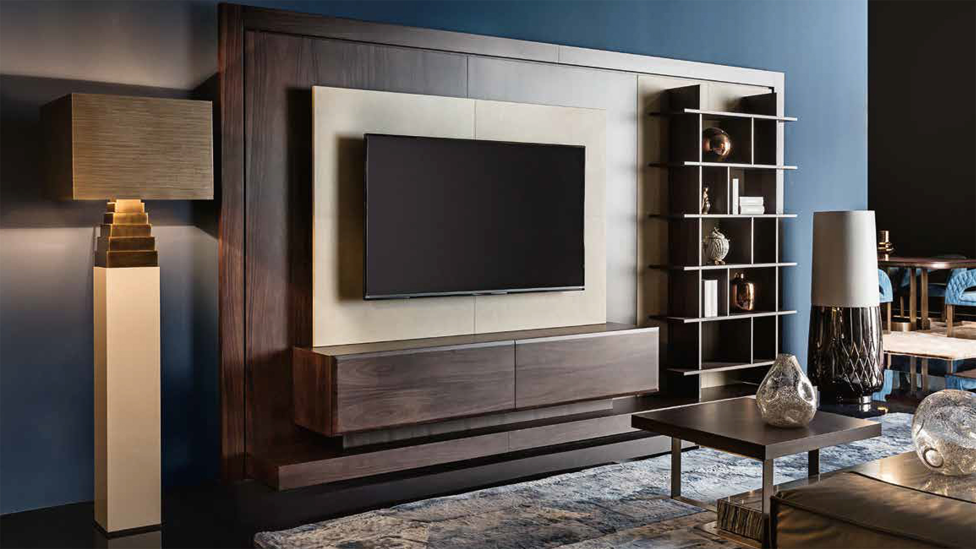 Տնային կինոթատրոն/ցուցապահարան՝ անփայլ վարդափայտից կամ անփայլ ծխախոտի գույնով, 1 հատված՝ կախովի դռնով և դարակով, լուսավորված, կաշվից կամ միկրոսաբուկից տնային կինոթատրոնի պանել, 1 ցուցապահարան 6 դարակով, փայլեցված սև նիկելի դետալներ։ Մոդուլյարությունը գտնում է իր տեղը.
