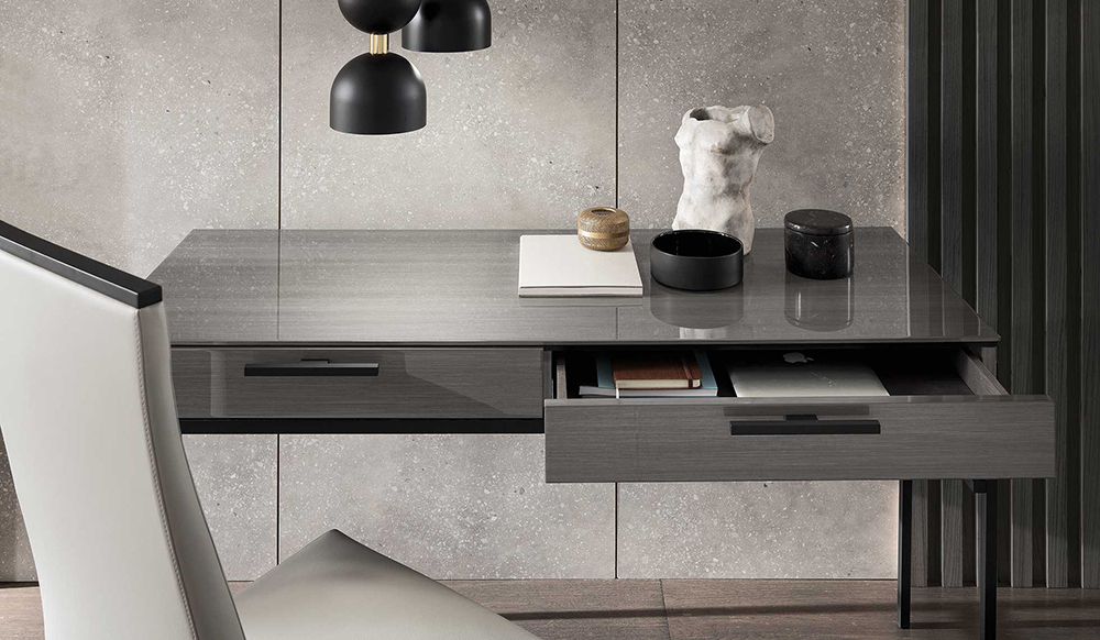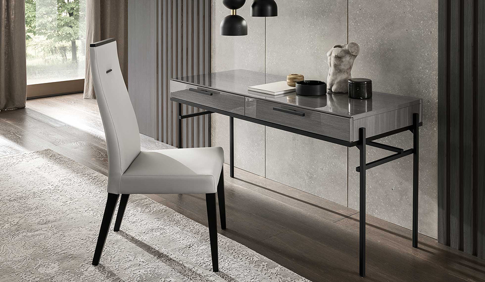Спальная группа Novecento изготовлена в Италии и покрыта глянцевым серебристым деревом с изголовьем из черной экокожи.