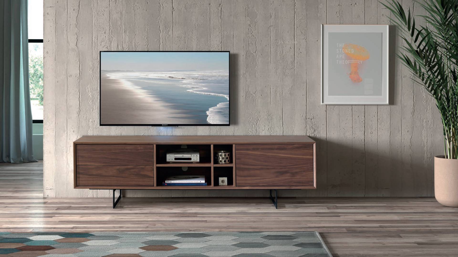 Тумба под телевизор. Столешница изготовлена из натурального шпона ореха, основание и ножки - из металла.