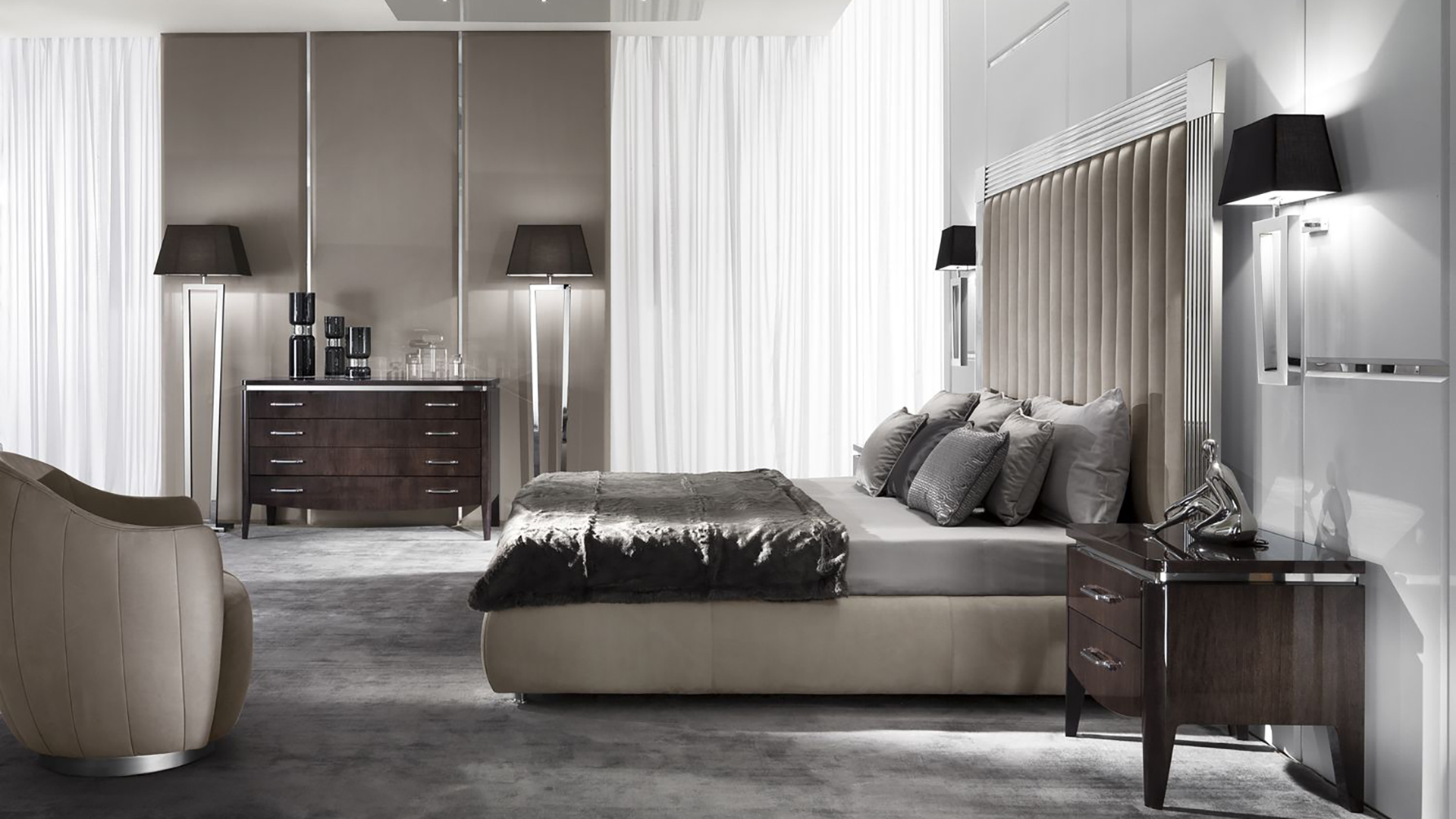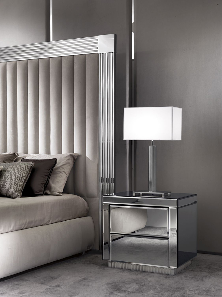 Кровать с фигурной каймой вокруг изголовья Windsor состоит из прочного деревянного каркаса с мягкой основой. Варианты обивки представлены в каталоге. Изголовье обрамлено широкой каймой, покрытой напылением с золотым или серебряным блеском. Дизайн дополняет рельефная поверхность изголовья, которая формируется ровными вертикальными линиями. Кровать в стиле ар-деко дополнит интерьер современной спальной комнаты.