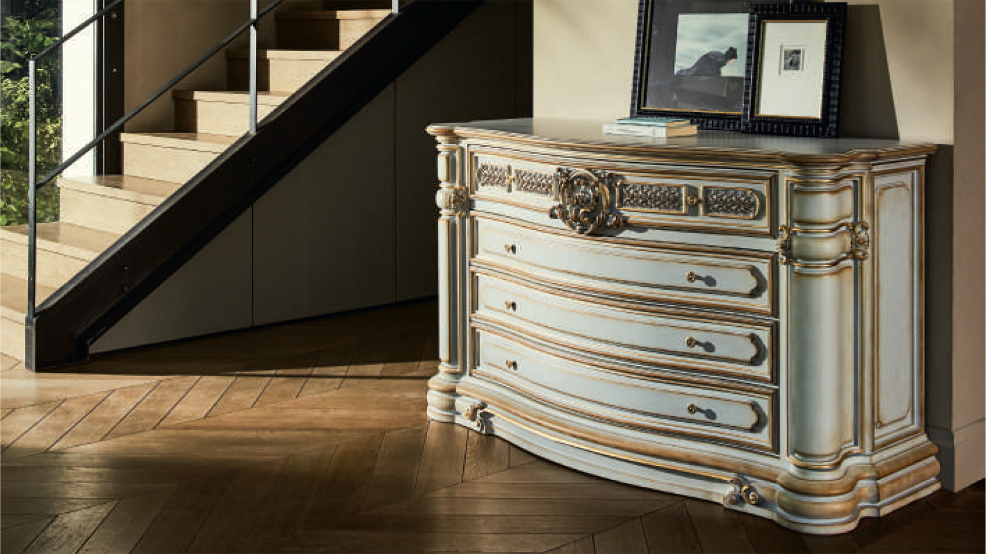 Комод с 4-мя ящиками. Деревянная столешница со стеклянным топом. Декор - пенополиуретан. Возможны другие варианты отделки.