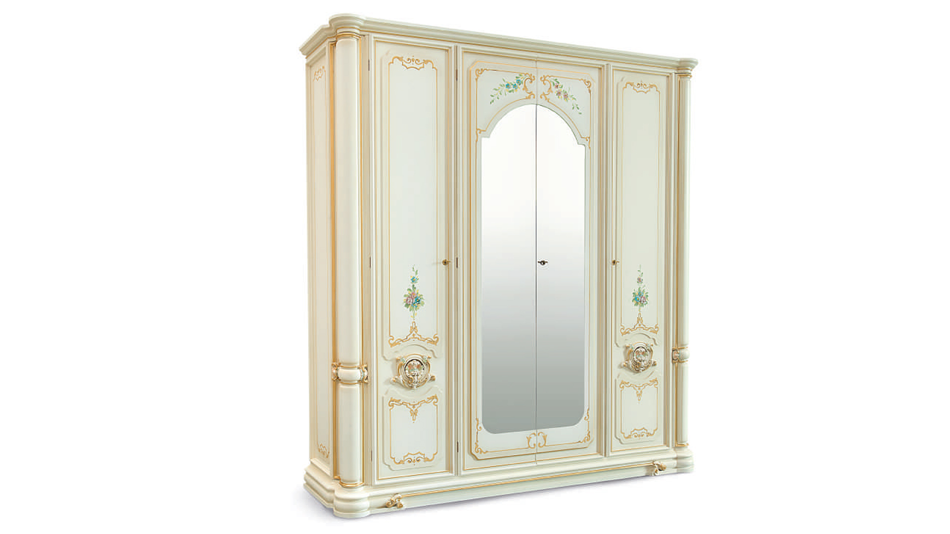 Платяной шкаф с 4 створками, из которых 2 зеркальные. Богатый выбор отделок.