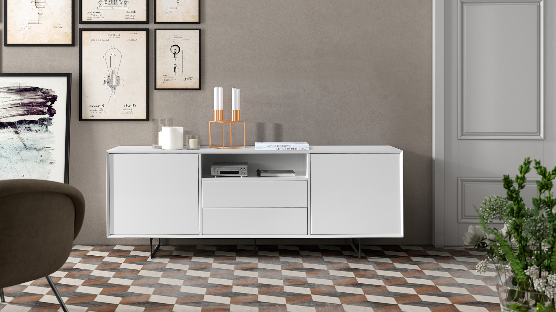 Двухдверный буфет с двумя ящиками покрытый высококачественным лаком. Двери и ящики оснащены системой push open. Ножки выполнены из металла, окрашенного в черный цвет.