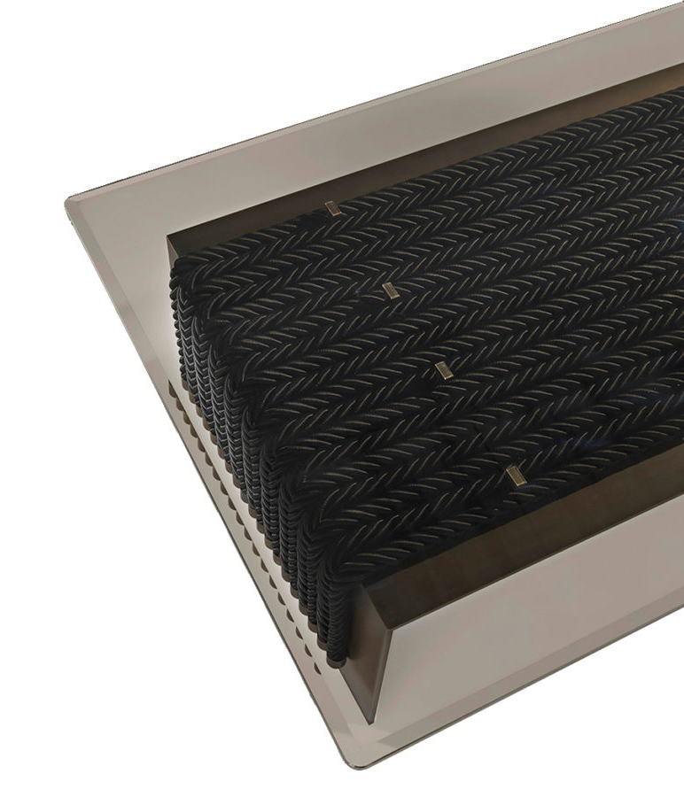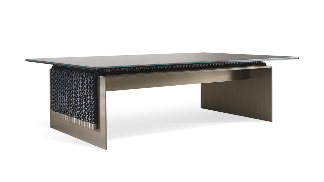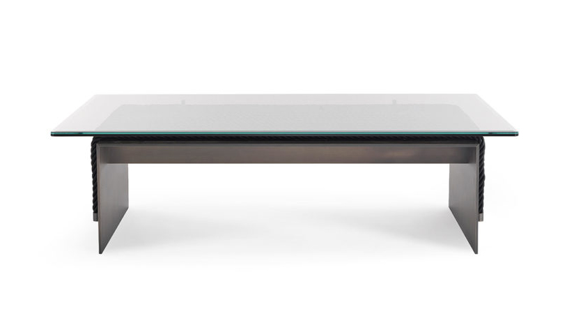 A central table that combines the simplicity of the contemporary design with a complex manufacturing: the 10mm thick metal structure supports the weight of the console giving stability to the whole, thus creating an original game of contrasts between lightness and stability. Enriched by decorative ropes running along the outer perimeter of the base, the central table is equipped with a refined laminated and ground bronzed glass top.