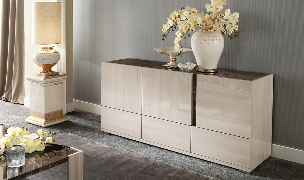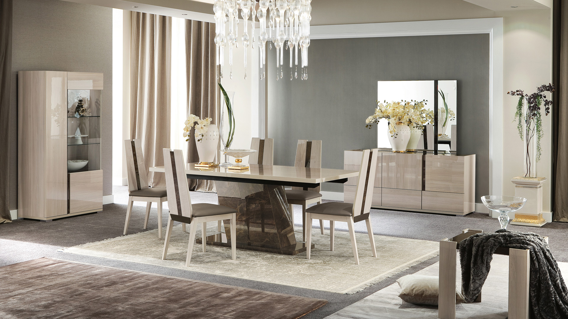 The Teodora Dining Table defines luxury and emphasizes modern design with elegant aspects. This table features finishes of Light Elm Veneer & Emperador Stone that are exquisitely mixed with perfect balance and Chrome accents.
