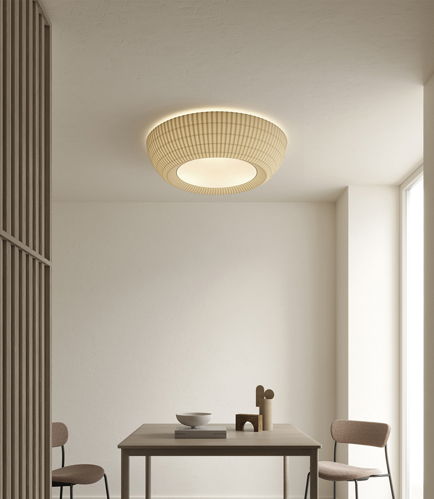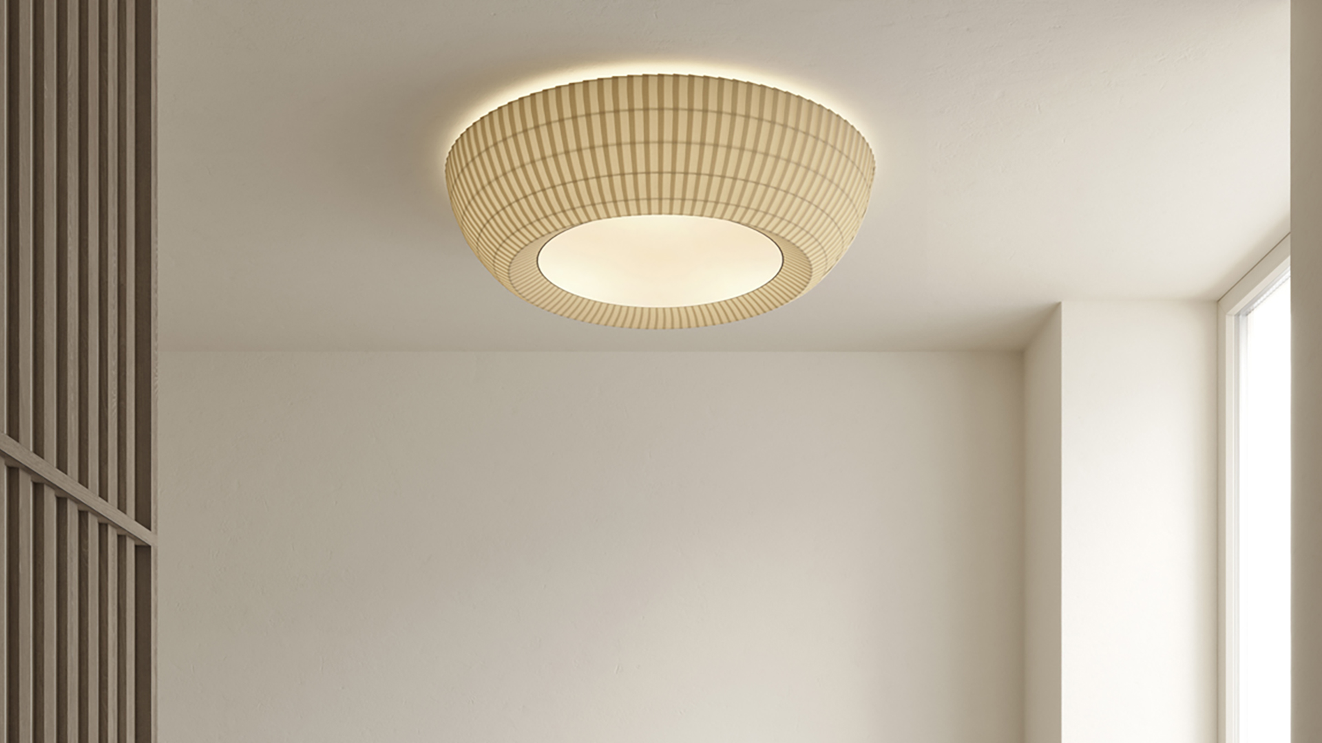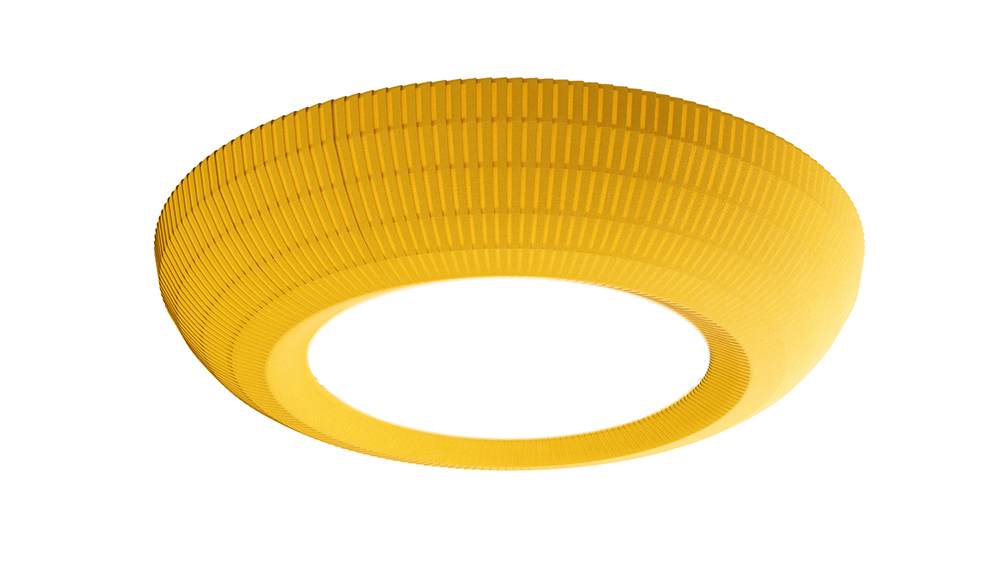 The ceiling version of Bell is in continuity with the aesthetic of the pendant one. The lightness given by the fabric, the multidimensionality and the chromatic variations remain unchanged. The adaptability to different contexts of this version is further granted by its smaller dimensions and the simplicity of its lines. Its pongé fabric, besides being flame-retardant, thanks to its texture, makes Bell an acoustic lamp. Its Equivalent Sound Absorbing Area up to 1.86, allows Bell to reduce the noise as far as 37%.