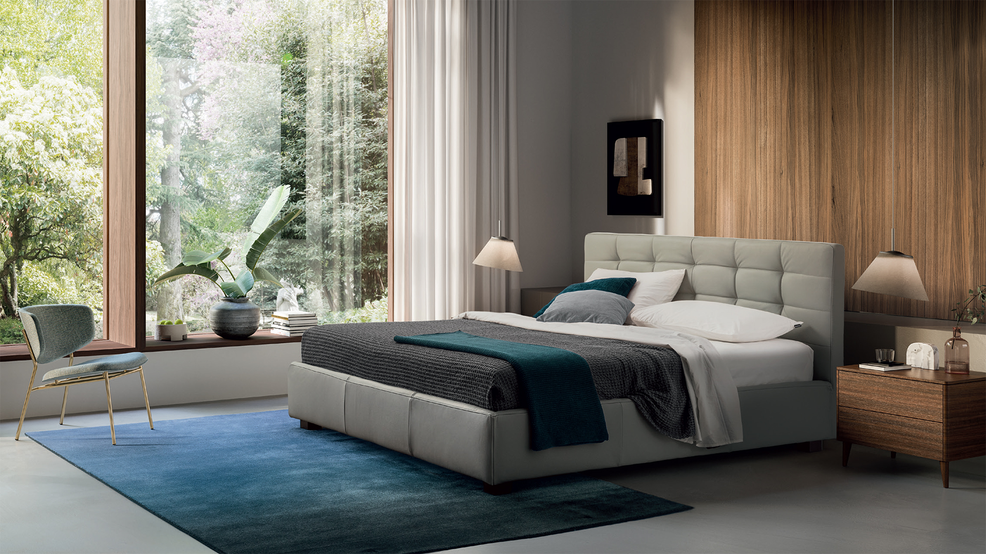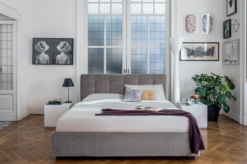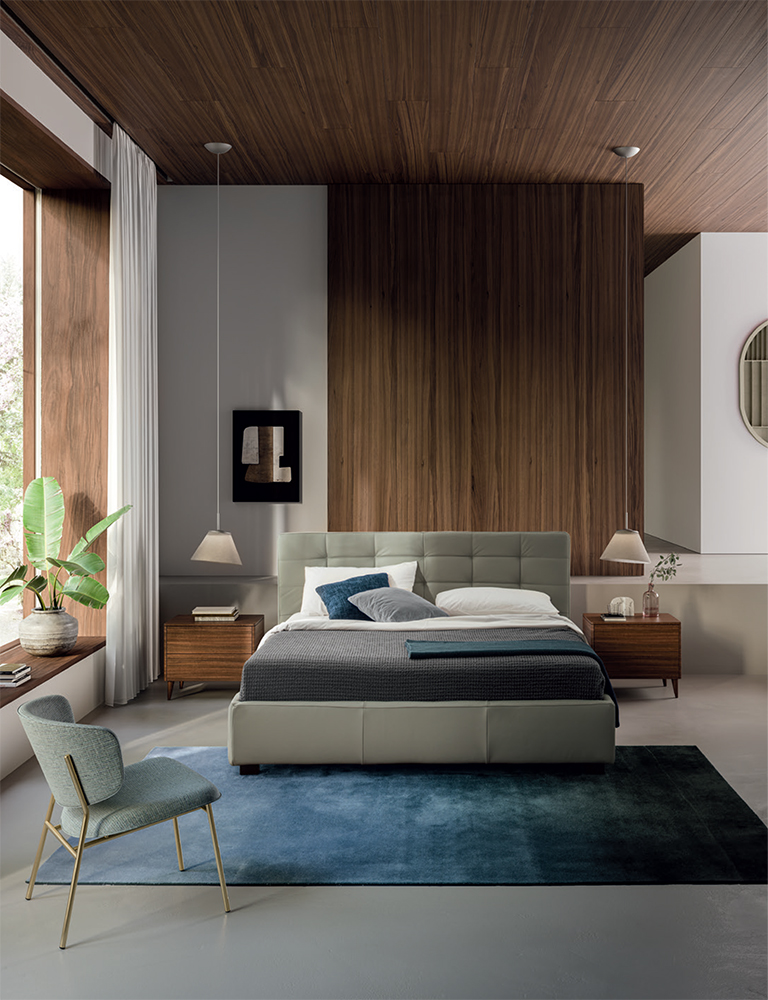 Monterey reworks the archetypal tradition of elegant diamond-tufted padding but puts a new spin on the pattern with sleek horizontal sections. Original quilting techniques have been adopted to celebrate the legendary expertise of Italian upholstery artisans. The item is available with three versions of the feet in wood or one version of the feet in metal with the option of choosing a look and height from the ground that suits the customer best. The Monterey bed is available with a fixed bed base or container unit. Can be upholstered in fabric or leather.