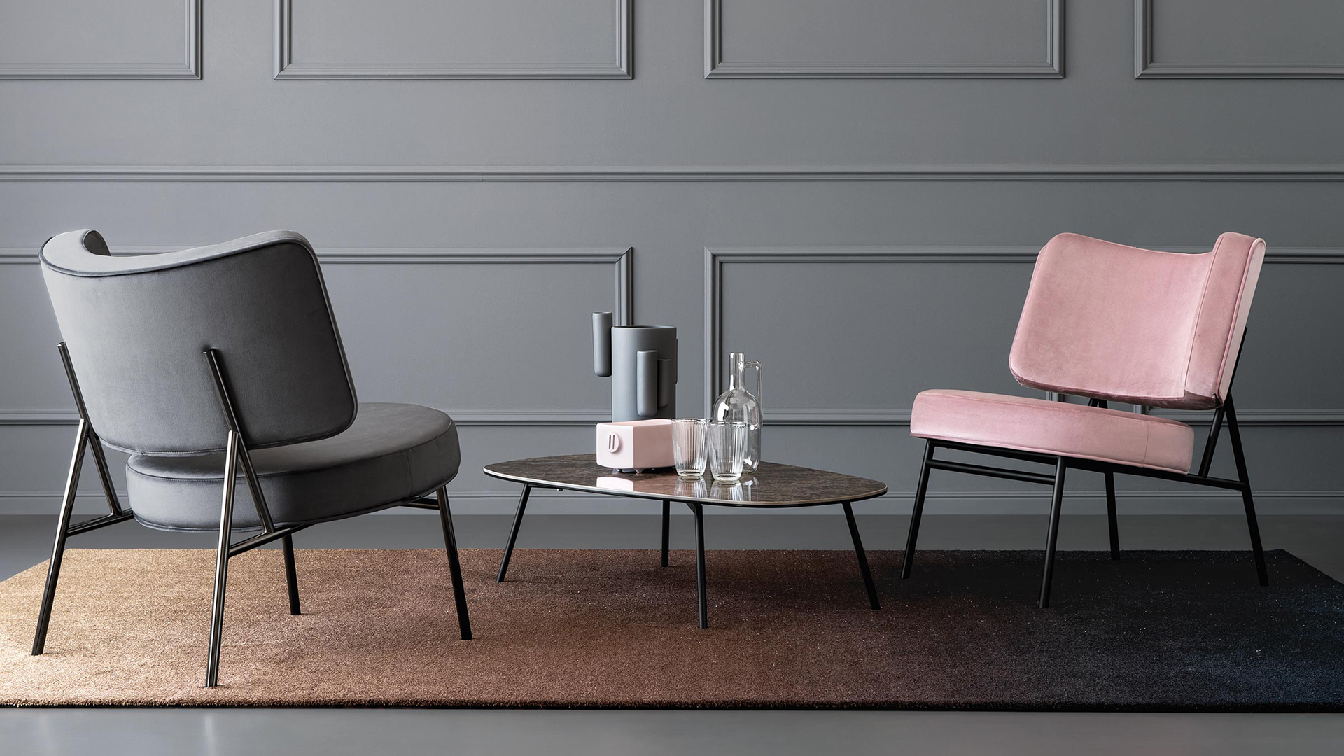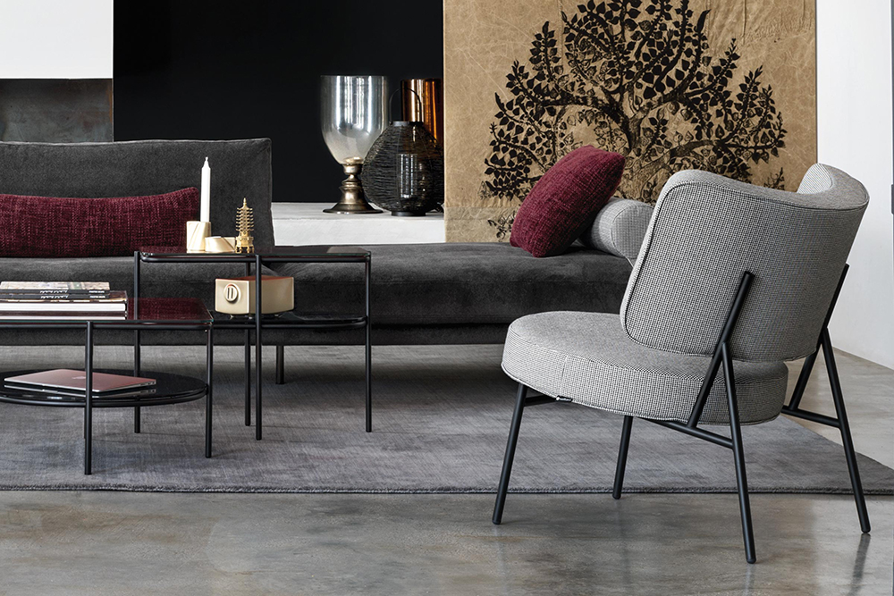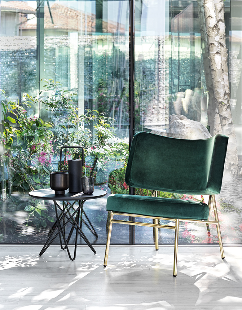 Coco is a tub chair with a ΓΈ20 mm tubular-metal frame. Padded seat cushion and backrest with fixed upholstery in velvet. Fashions pass, style remains.