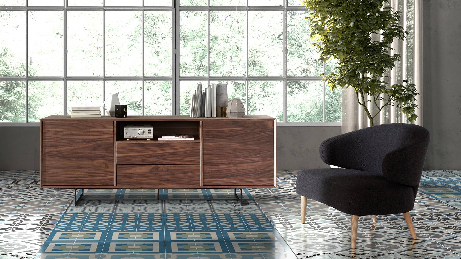 2-Doors and 2 drawers Buffet walnut veneered with inner middle shelves. Push system.