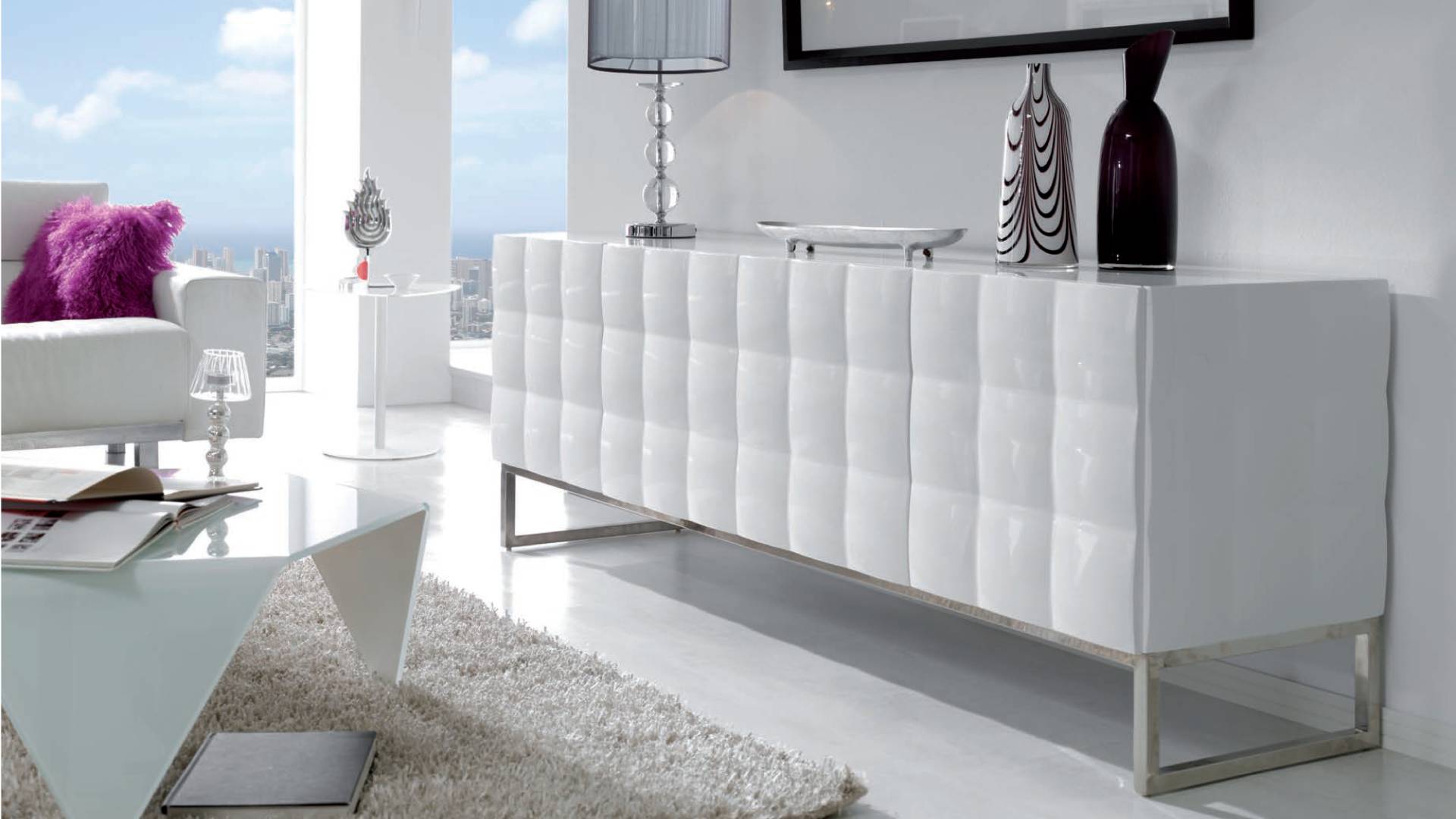 Wooden horizontal sideboard with a unique 3D design. Covered with high gloss lacquer and has 4 doors equipped with a system of opening to open doors.