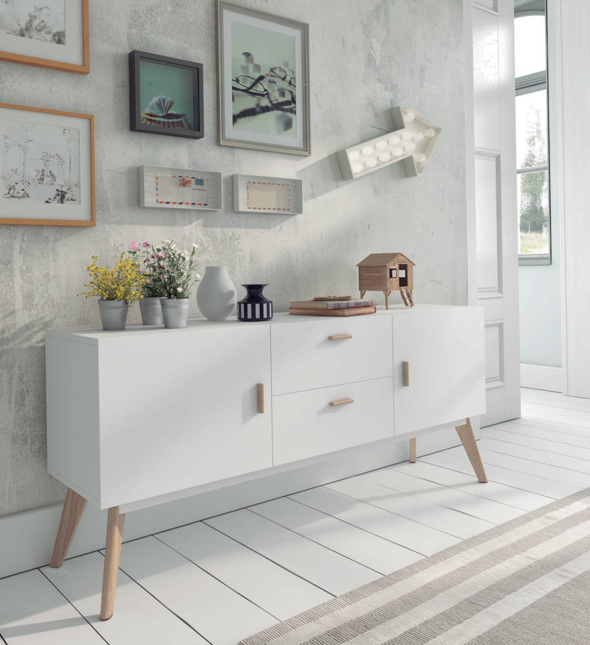 Buffet in MDF board in semimat white. Two drawers and two doors, inner shelves. Oak wood legs. Color: white.