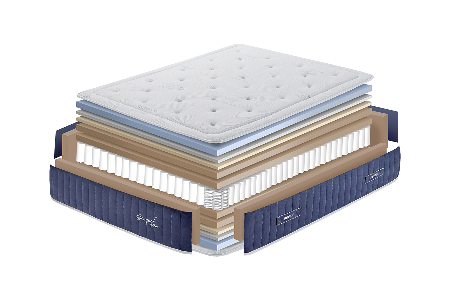 Since 1966 when we started DUPEN, we are committed to protecting our planet and our natural resources. The new Pacific Seaqual mattress is created from plastic waste collected from the Mediterranean sea. The fabrics are made of high quality polyester thread from recycled materials that include plastic bottles and other plastics captured from the sea. This is our contribution to help preserve natural resources and keep the oceans cleaner. This mattress is made with the highest manufacturing standards and is developed with the best raw materials to help save our planet.