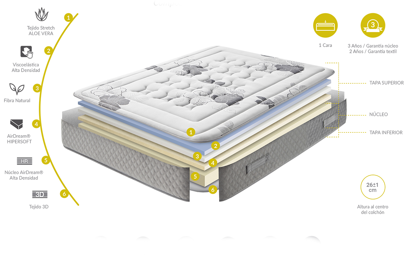 High density HR core mattress for better back support combined with memory foam. Mattress is upholstered with soft luxury stretch fabric, has design soft padded sides, four horizontal handles embroidered for easy turning the mattress and cooling 3D breathable fabric for the base layer of mattress that helps to regulate your body temperature dissipating moisture and maintain optimum warmth and comfort during your sleep.