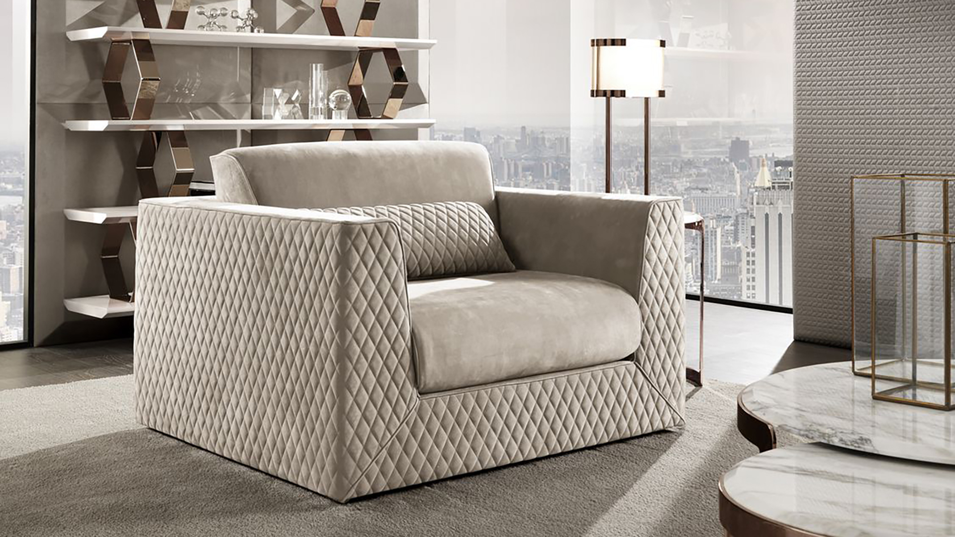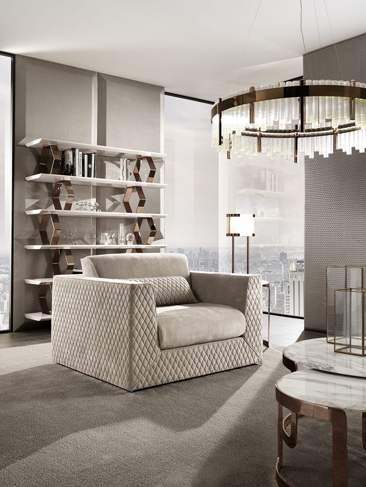 The Cooper chair is a solid size, lush volume and anatomical design. The armchair has a well-defined geometric frame with wide armrests and a quilted cover that makes it look like other pieces from the same collection.