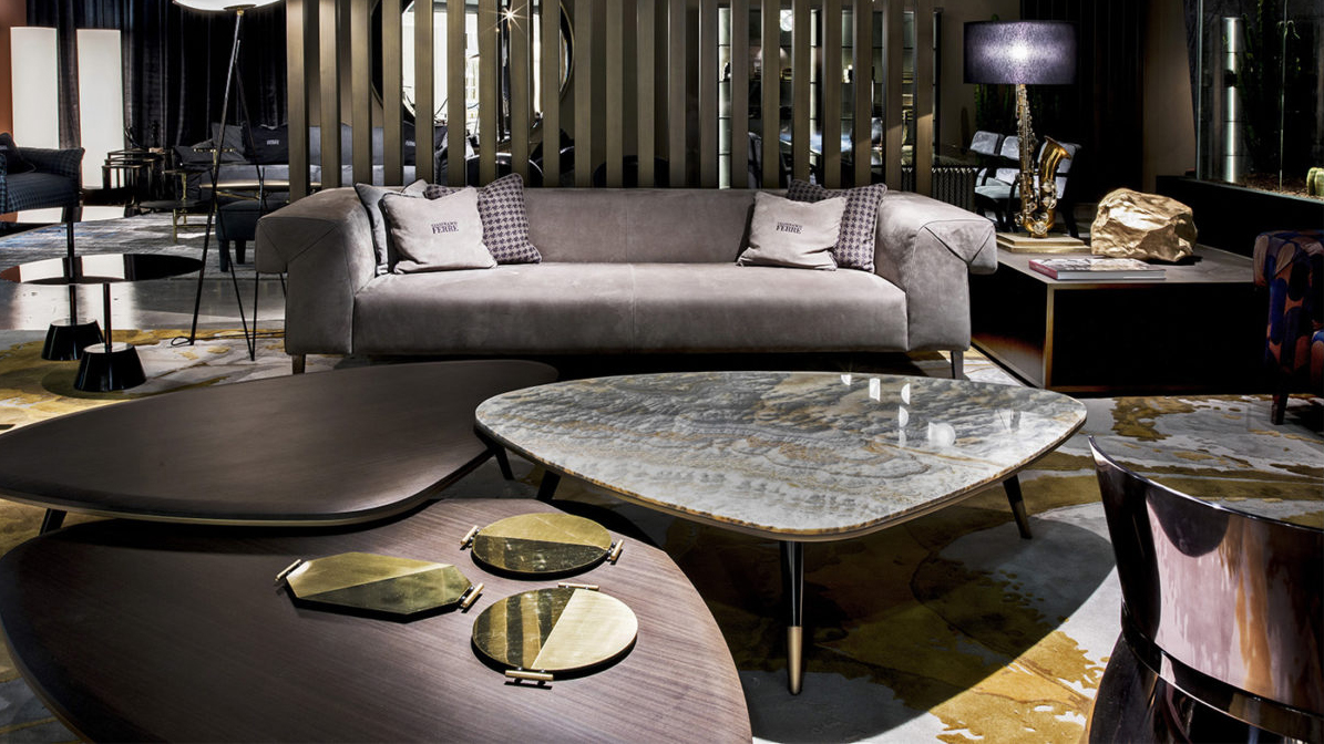 Inspired by the 50s and characterized by oblique legs, brass caps and profiles, curved top with an irregular shape, Camberwell tables allow you to create unique compositions thanks to the different heights and materials available for the top, such as marble or tay wood tinted smoky grey.