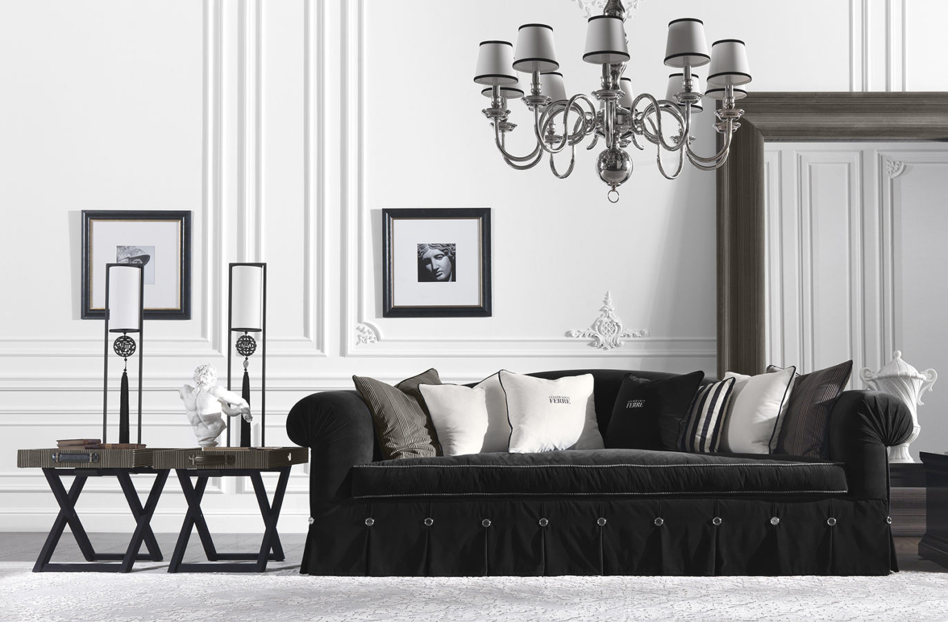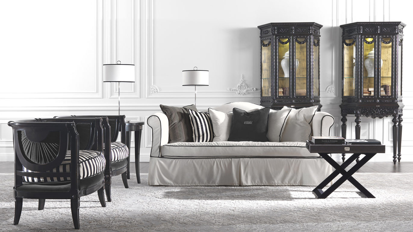 Side table with tray. Base in beech wood covered with black microfibre. 2 leather handles. Tray in multi-layer poplar covered in fabric cat. A | L.14.25.